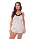 Baby Doll confeccionado em malha Liberty, leve e macia, com estampas clássicas, delicadas e atemporais. A blusa apresenta alças reguláveis no mesmo material do viés, garantindo ajuste perfeito e conforto. O decote em V suave no peito é finalizado com acabamento em renda tom sobre tom, acrescenta um toque sofisticado e feminino, além da delicada flor em cetim que valoriza o detalhe. O short, de comprimento curto, possui caimento leve e confortável, com viés aplicado um pouco acima da barra, mantendo a harmonia com a blusa e reforçando a estética romântica do conjunto.