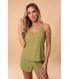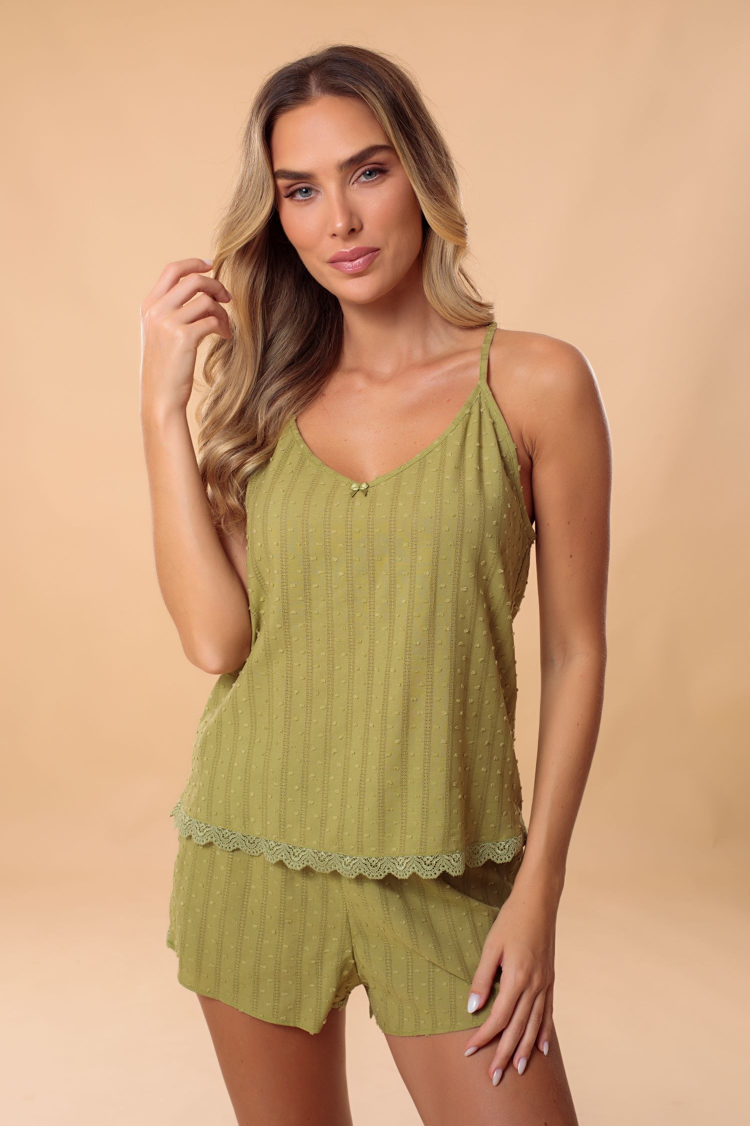 Itacaré Linen Jacquard é o nome do tecido plano que escolhemos na criação do baby doll Mavie. Sua composição mistura fibras de viscose, algodão e linho. A sua superfície é toda trabalhada formando texturas com mini-pompons. Um lindo tecido que possui um ar romântico e natural deu vida a este modelo que traz todo o frescor de uma peça soltinha e bastante respirável, ideal para as noites de verão. E nos detalhes, rendas especialmente tingidas no tom do tecido, conferem romantismo e delicadeza ao modelo.