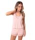 texturizados de poliéster, com acabamento estonado. No decote um recorte em ?V? mais profundo, revestido por renda e laço duplo, enfatizam o seu aspecto romântico. Recortes laterais em renda conferem um charme a mais, e para finalizar, um
