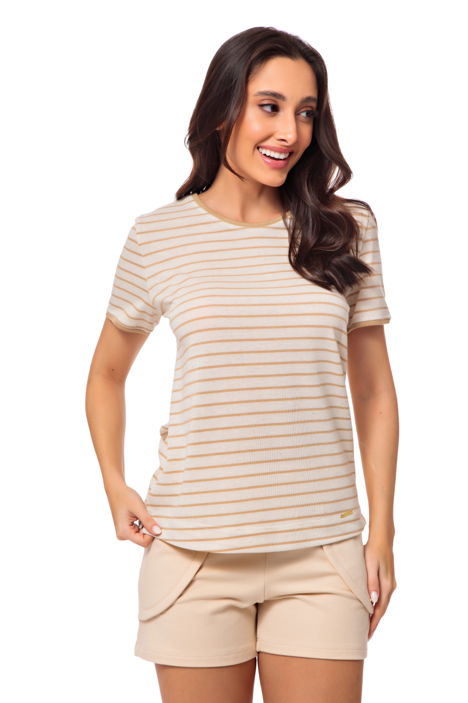 Blusa de modelagem básica, em malha listrada Tricot Sienna, com decote redondo e punhos contrastantes. Blusa com ótimo caimento que produz looks elegantes e confortáveis. Na composição da malha, fibras naturais como o algodão e o linho destacam seu aspecto natural. Este produto possui o selo Eco Pet, pois trata-se de uma malha que utiliza poliéster PET reciclado em sua composição.