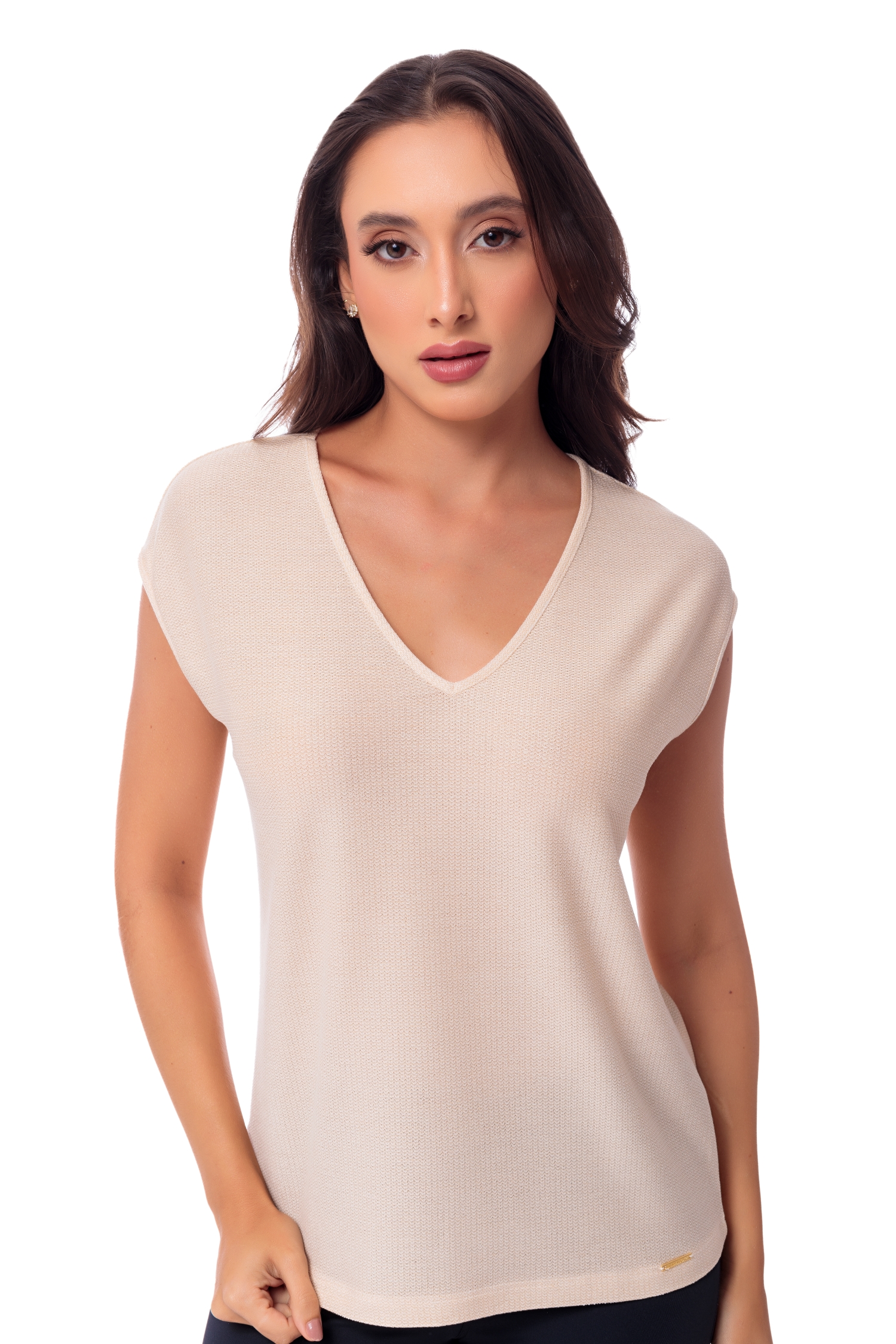 A blusa Duda possui modelagem solta do corpo, mangas japonesas e decote V. A manga japonesa é um tipo de manga que não possui cavas, ela já parte do corpo da blusa e geralmente é curta. Um modelo básico desenvolvido na malha Eccentric Shine, planejado para as mulheres montarem looks casuais com uma pitada de glamour, dada pelo brilho do material. A mistura da viscose com poliéster e poliamida, além do elastano, deram origem a uma malha leve, macia e confortável, além de muito bonita.