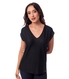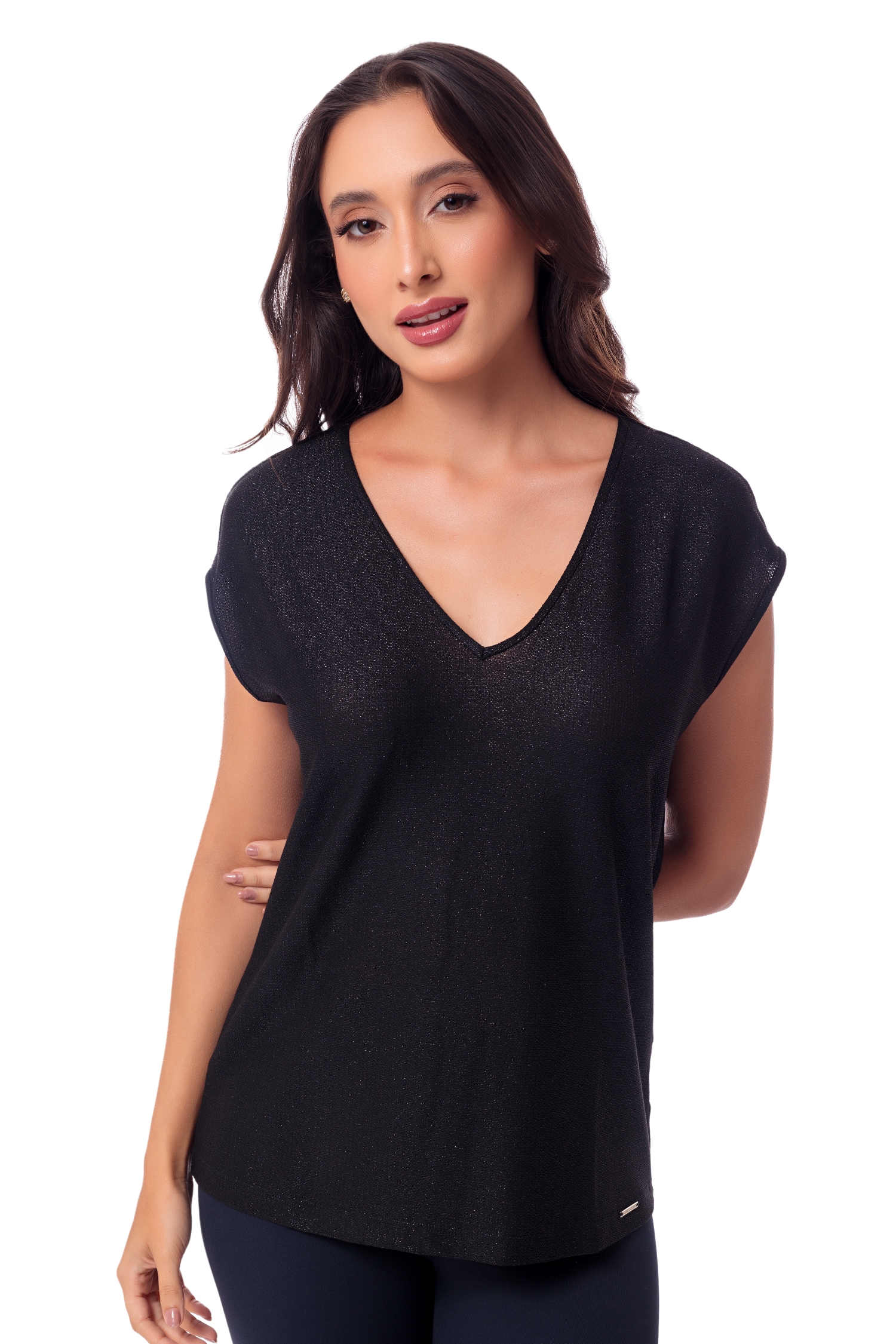A blusa Duda possui modelagem solta do corpo, mangas japonesas e decote V. A manga japonesa é um tipo de manga que não possui cavas, ela já parte do corpo da blusa e geralmente é curta. Um modelo básico desenvolvido na malha Eccentric Shine, planejado para as mulheres montarem looks casuais com uma pitada de glamour, dada pelo brilho do material. A mistura da viscose com poliéster e poliamida, além do elastano, deram origem a uma malha leve, macia e confortável, além de muito bonita.