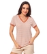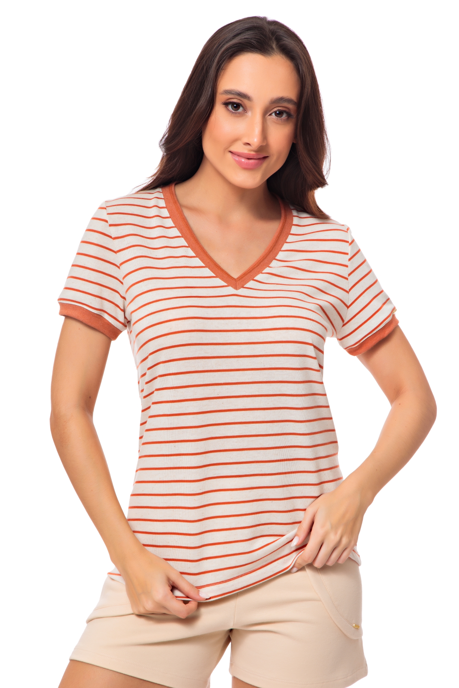 Blusa de modelagem básica, em malha listrada Tricot Sienna, com decote em ?V?e punhos contrastantes. Blusa com ótimo caimento que produz looks elegantes e confortáveis. Na composição da malha, fibras naturais como o algodão e o linho destacam seu aspecto natural. Este produto possui o selo Eco Pet, pois trata-se de uma malha que utiliza poliéster PET reciclado em sua composição.
