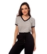 Blusa de modelagem básica, em malha listrada Tricot Sienna, com decote em ?V?e punhos contrastantes. Blusa com ótimo caimento que produz looks elegantes e confortáveis. Na composição da malha, fibras naturais como o algodão e o linho destacam seu aspecto natural. Este produto possui o selo Eco Pet, pois trata-se de uma malha que utiliza poliéster PET reciclado em sua composição.