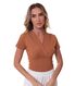 A blusa Fabiana possui mangas curtas e modelagem ajustada ao corpo; um recorte abaixo do busto fornece sustentação e o decote drapeado e transpassado valoriza o corpo com muita feminilidade. A malha escolhida para este desenvolvimento foi a Ice Touch Microfibra por ser apropriada para peças ajustadas. Essa malha é macia e conta com o toque refrescante da poliamida, sendo uma excelente escolha para o verão.