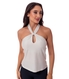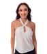 A blusa Kika traz uma modelagem tipo frente única, com abertura no decote, por onde transpassa uma faixa que amarra no pescoço. Este modelo valoriza ombros e costas, deixando as mulheres ainda mais charmosas. Além disso, o brilho da malha Eccentric Shine confere um certo glamour ao produto. Uma malha leve, macia e confortável produzida pela mistura da viscose com poliéster e poliamida, além do elastano, que origina peças com valor agregado.