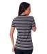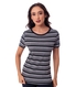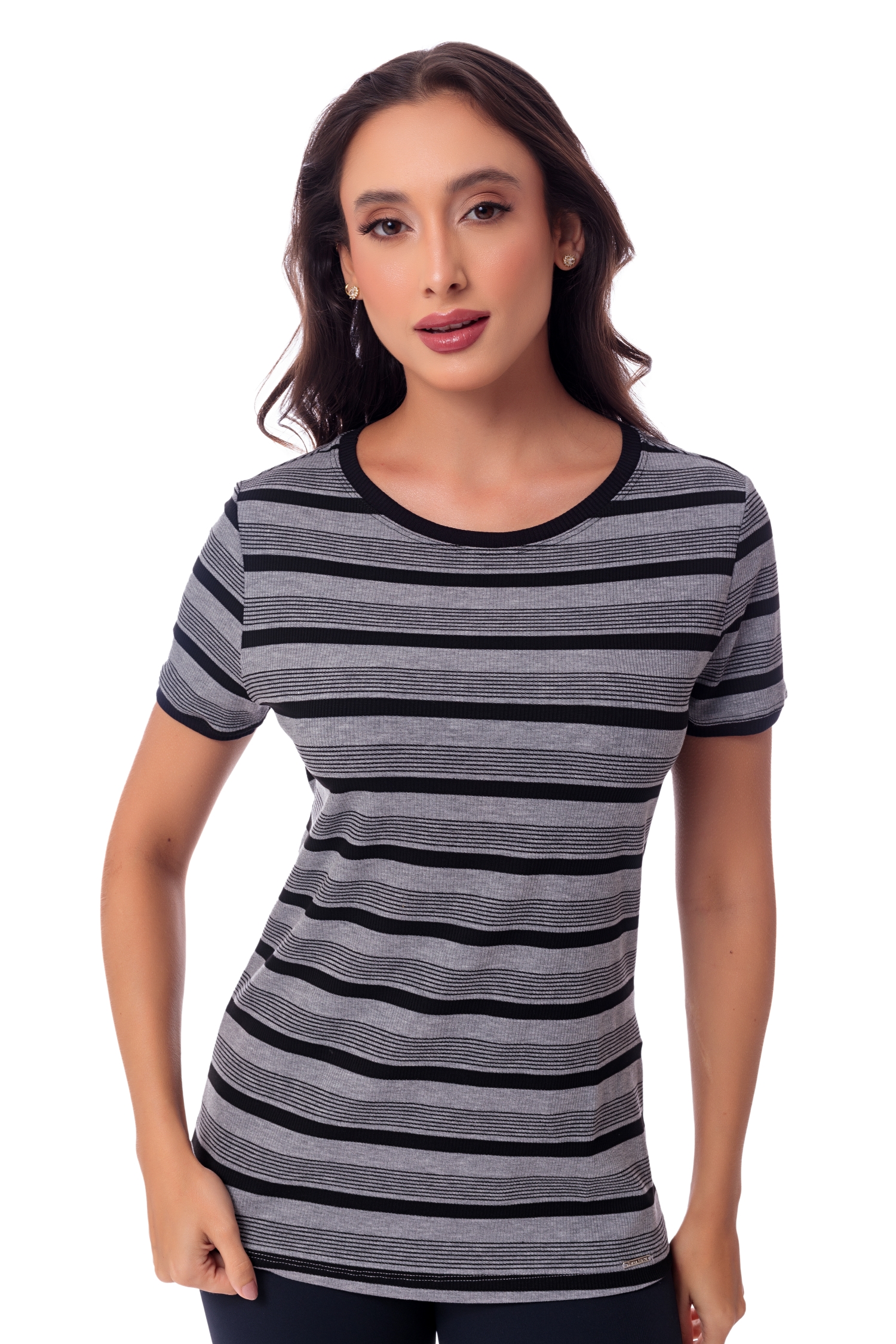Blusa básica com mangas curtas, em malha canelada Maitê listrada com acabamentos em malha canelada lisa. Este artigo traz todo o frescor da viscose com a flexibilidade e conforto do elastano. Uma perfeita combinação de cores em um modelo atemporal e curinga que facilmente faz composição com shorts, saias e calças. Modelagem levemente solta do corpo, que se ajusta aos mais diversos biotipos devido ao canelado característico desta malha.