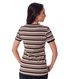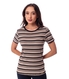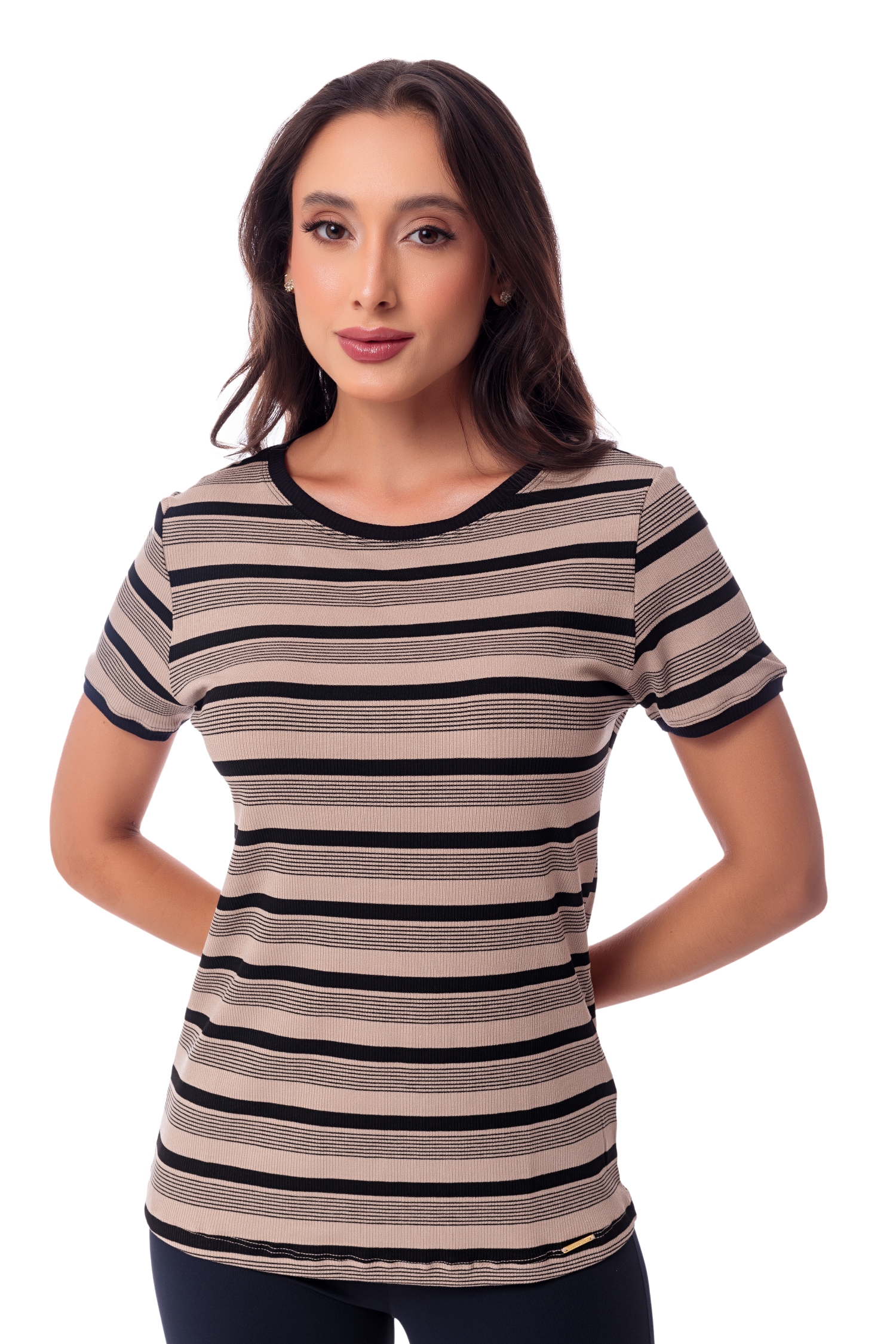 Blusa básica com mangas curtas, em malha canelada Maitê listrada com acabamentos em malha canelada lisa. Este artigo traz todo o frescor da viscose com a flexibilidade e conforto do elastano. Uma perfeita combinação de cores em um modelo atemporal e curinga que facilmente faz composição com shorts, saias e calças. Modelagem levemente solta do corpo, que se ajusta aos mais diversos biotipos devido ao canelado característico desta malha.