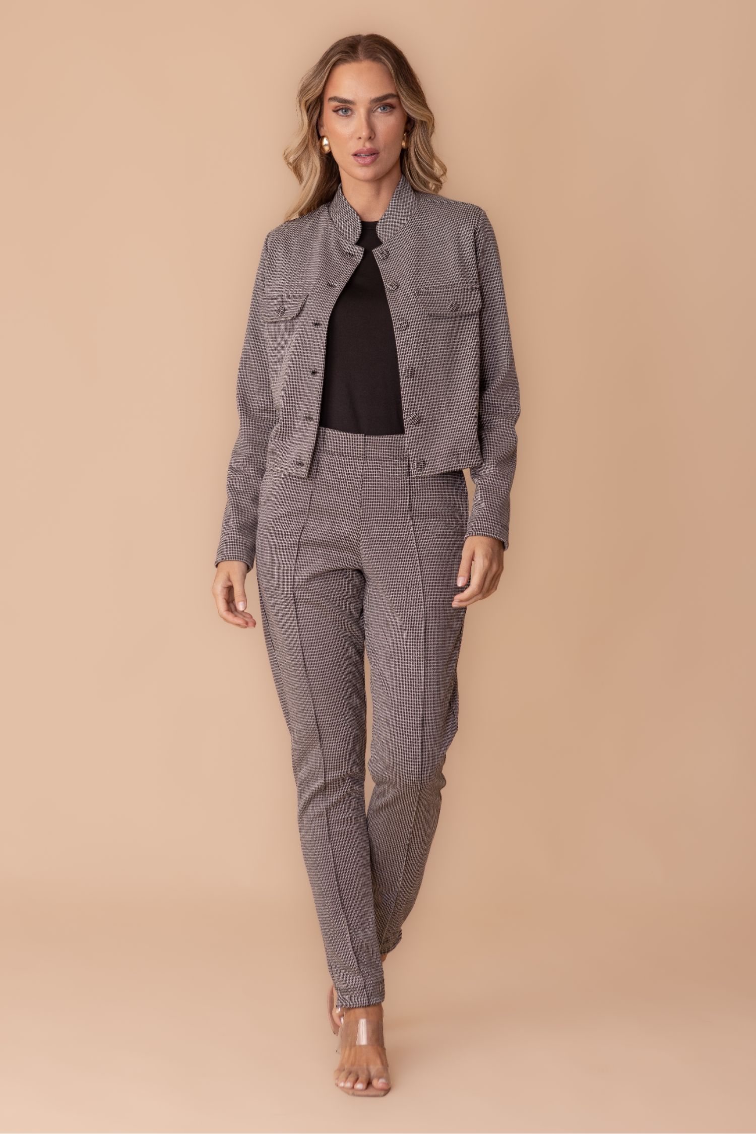 A calça PARIS traz um ar mais arrumado ao visual. Ela é produzida em um Jacquard de alta gramatura, que não marca o corpo e, com isso, traz maior elegância para o look. Um produto de alta durabilidade e versatilidade no uso, além de muito confortável e prático, pois não amarrota facilmente. Sua padronagem em chess, os bolsos embutidos e as nervura na parte da frente da calça, remetem aos detalhes clássicos da alfaiataria. E para combinar, oferecemos também o casaco Paris que, quando usados juntos, formam um look estiloso e elegante em cores sóbrias e modernas.