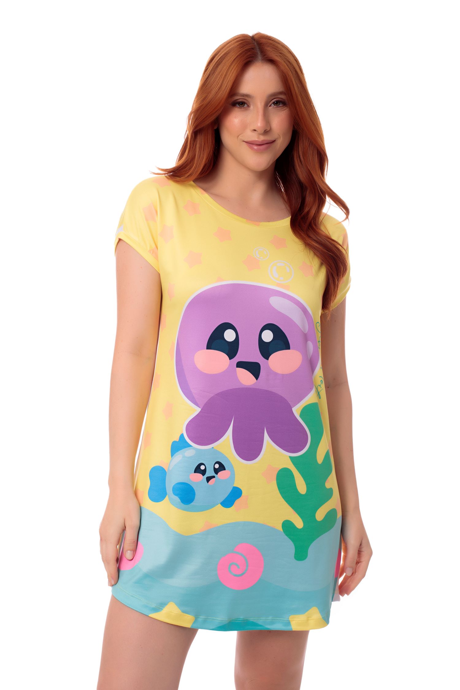 Camisetão de modelagem solta e confortável, perfeito para noites leves e relaxantes. Confeccionado em tecido Peach Skin, que possui toque macio e suave semelhante ao da pele de pêssego, oferece frescor e excelente caimento. O design conta com recorte frente e verso, além de mangas japonesas, que proporcionam liberdade de movimentos e um visual despojado. Pertencente a linha divertida, a peça é valorizada por estampas exclusivas desenvolvidas especialmente para o verão, unindo praticidade, estilo e descontração.