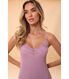 finas com regulagem, que permitem melhor ajuste ao corpo. Na parte frontal, destaca-se um decote em V suave, adornado