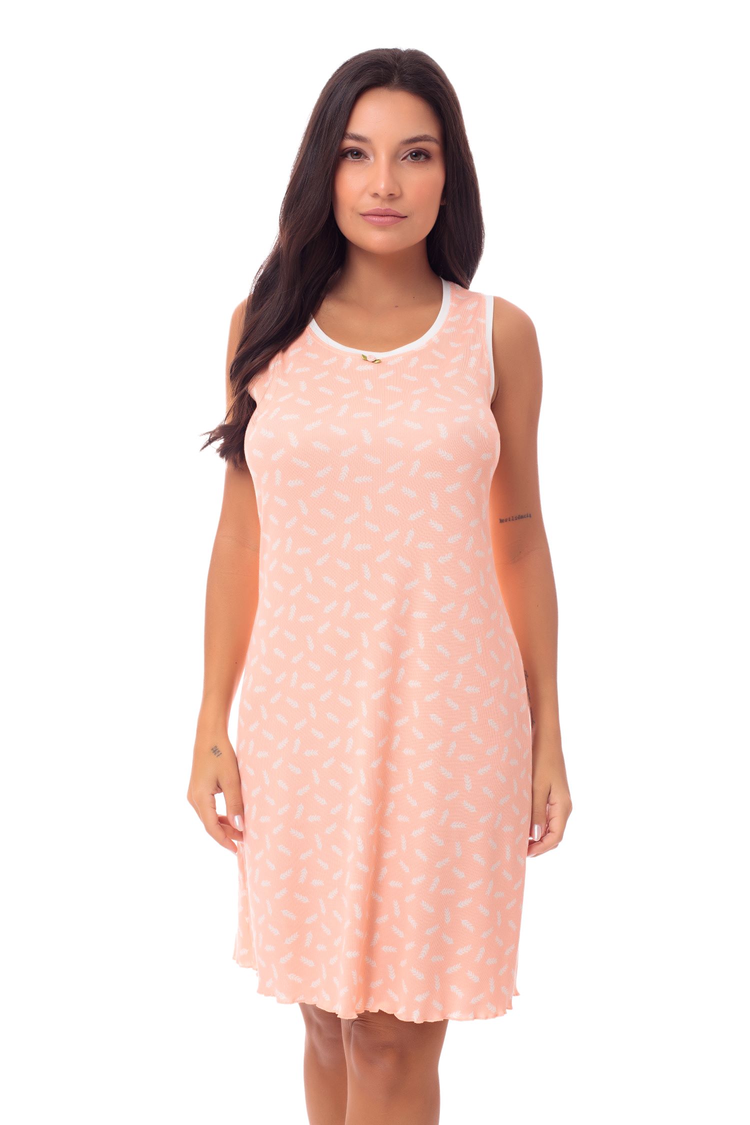 Camisola confeccionada em malha Liberty, leve e macia com estampas clássicas, delicadas e atemporais. Possui modelagem solta, oferecendo conforto e fluidez ao vestir, com comprimento levemente acima do joelho e acabamento em frufru. O design regata apresenta alças mais largas com acabamento em viés, proporcionando bom caimento e durabilidade. A gola arredondada recebe um toque romântico através do detalhe de flor aplicada em cetim, que valoriza o visual delicado e feminino da peça.