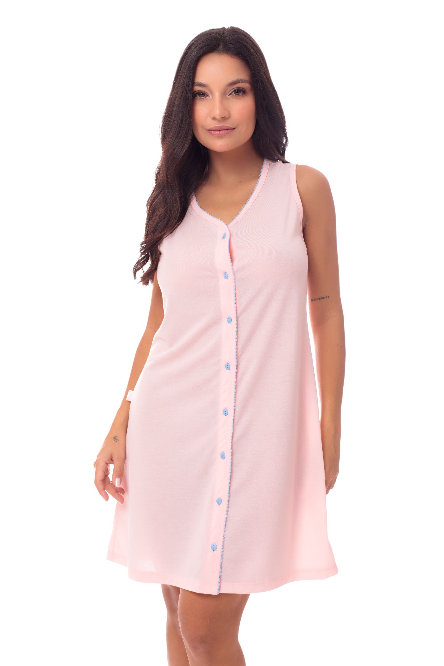 Para a produção da Camisola Marcia optamos pelo algodão, buscando atender as demandas de um público que dá preferência por fibras naturais, frescas e confortáveis. A modelagem é cavada e a abertura frontal favorece todas as pessoas, mas em especial as lactantes e também pessoas que estão em recuperação cirúrgica, etc., facilitando o uso e o vestir. O contraste colorido dos botões trazem jovialidade ao modelo; e o acabamento final fica por conta da picueta, uma espécie de ponto de crochê que reveste toda a abertura da blusa. Um modelo que traz simplicidade e conforto!