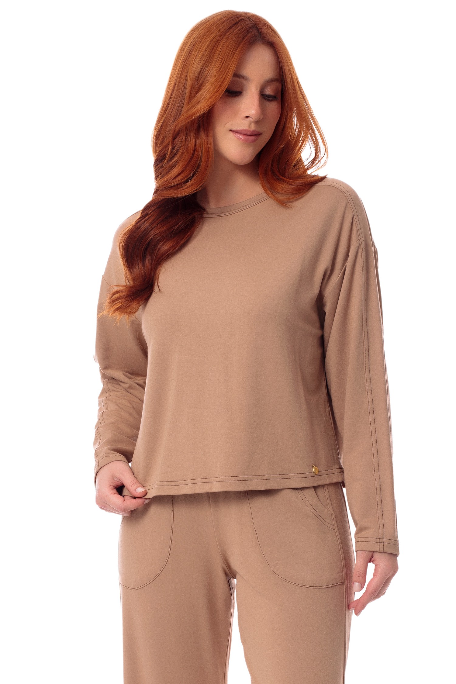 Conjunto feminino elegante e contemporâneo, composto por blusa de mangas amplas e corte de gola arredondada, que confere um visual casual com sofisticação. Os pespontos aparentes acrescentam charme artesanal e destacam o acabamento da peça. A calça possui modelagem pantalona, com pernas soltas que proporcionam leveza ao caminhar e caimento fluido. Ideal para produções que equilibram conforto, estilo e presença, o conjunto transita com facilidade entre ocasiões formais e descontraídas. Confeccionado no tecido moletom MVS Stretch, o conjunto conta com tecnologia que proporciona maior resistência ao pilling, toque suave e excelente elasticidade, garantindo conforto e durabilidade no uso cotidiano.