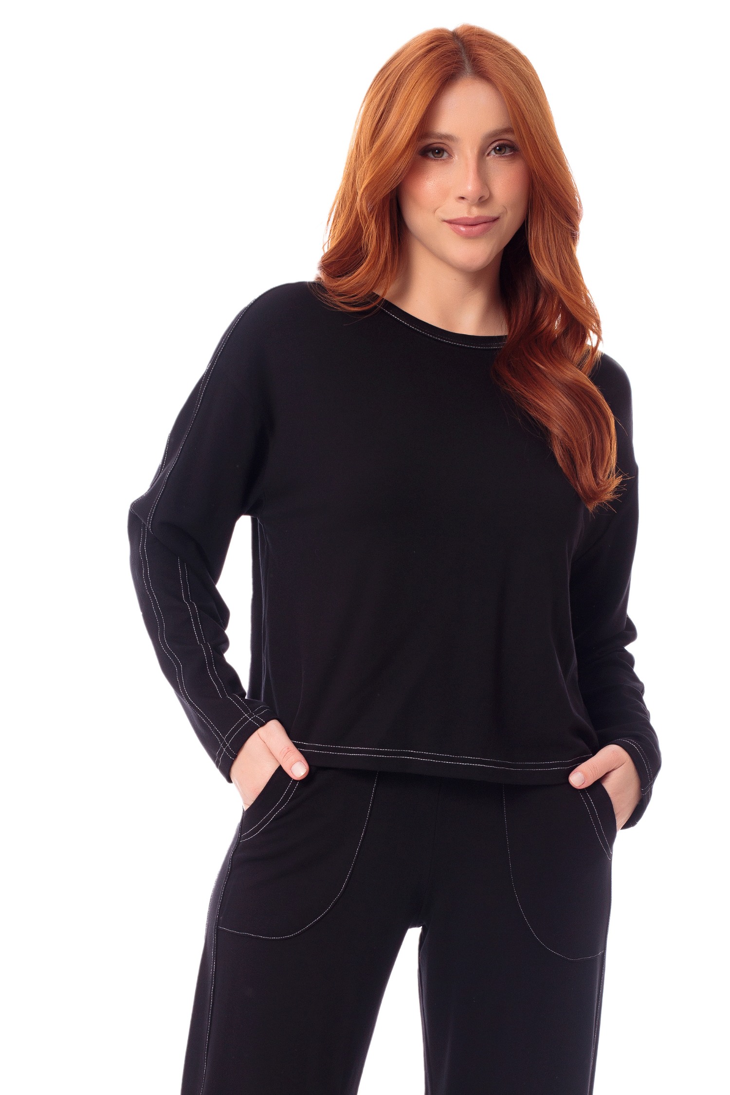 Conjunto feminino elegante e contemporâneo, composto por blusa de mangas amplas e corte de gola arredondada, que confere um visual casual com sofisticação. Os pespontos aparentes acrescentam charme artesanal e destacam o acabamento da peça. A calça possui modelagem pantalona, com pernas soltas que proporcionam leveza ao caminhar e caimento fluido. Ideal para produções que equilibram conforto, estilo e presença, o conjunto transita com facilidade entre ocasiões formais e descontraídas. Confeccionado no tecido moletom MVS Stretch, o conjunto conta com tecnologia que proporciona maior resistência ao pilling, toque suave e excelente elasticidade, garantindo conforto e durabilidade no uso cotidiano.