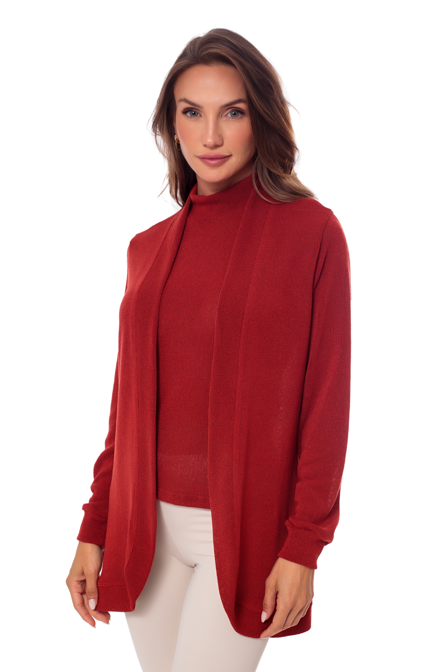 A ?terceira peça? é aquela peça que finaliza uma produção como o blazer, parka, casaco, kimono ou, até mesmo, lenços, cachecóis e pashminas. O cardigan Suzana foi desenvolvido para ser uma ?terceira peça? bem neutra e coringa para finalizar diversos tipos de looks. O acabamento arredondado traz um movimento suave e feminino, que são puro charme. A malha utilizada neste produto é a malha kate moss, que possui aspecto de tricô, ótimo caimento e conforto, proporcionando proteção na medida certa, sem aquecer demais. *Produto vendido individualmente. Não acompanha demais produtos ou acessórios visíveis na imagem.