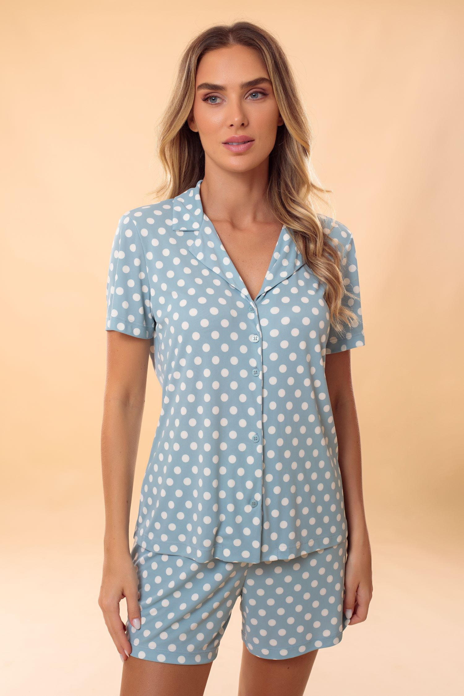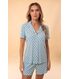 Pijama estilo americano, composto por blusa que lembra uma camisa e short de comprimento confortável. O pijama Carolina é confeccionado em malha leve e macia, a poliamida Plume, também conhecida como ?malha fria?. Este modelo é atemporal e agrada a todos os estilos independente da faixa etária. Além de elegante, o modelo torna-se funcional para mulheres que amamentam, ou que passam por algum procedimento cirúrgico, pois sua abertura facilita o vestir e o despir.