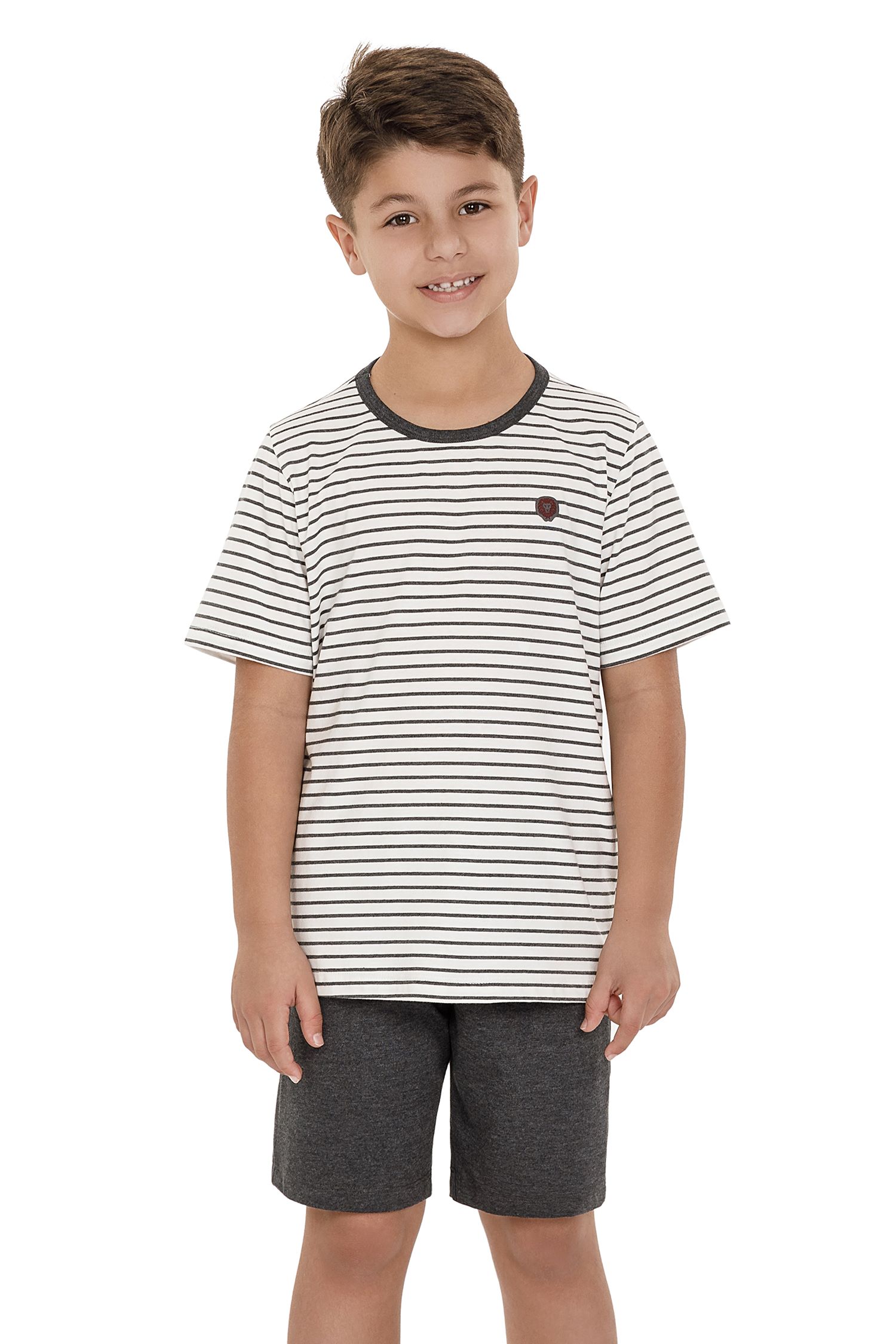 O pijama George infantil, elaborado em camiseta listrada e bermuda lisa, é puro conforto, pois é confeccionado com algodão sustentável certificado pela ABR. Possui etiqueta termocolante Clava na parte frontal da camiseta. Disponível para compor Pai e Filho.