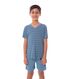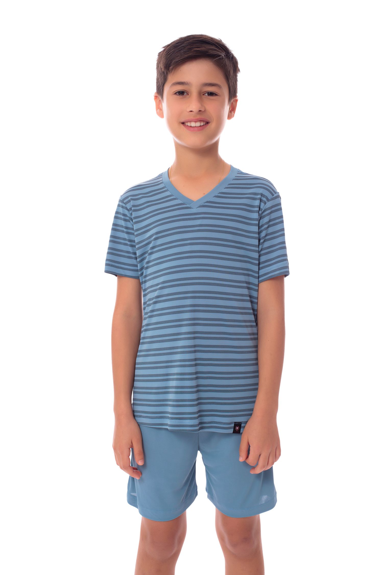 Pijama Infantil Masculino Heitor Curto - Conjunto de pijama composto por camiseta de manga curta e bermuda, ideal para os dias mais quentes. A parte superior é confeccionada em Malha Plume listrada ? um tecido leve, ultramacio e com toque sedoso, que proporciona conforto térmico e excelente caimento. A camiseta apresenta modelagem confortável, com listras horizontais sutis que conferem um visual contemporâneo e delicado. A bermuda lisa, feita no mesmo material em cor coordenada, tem cós elástico embutido, garantindo ajuste prático e liberdade de movimentos. Um conjunto que une estilo, funcionalidade e bem-estar para o momento de descanso.