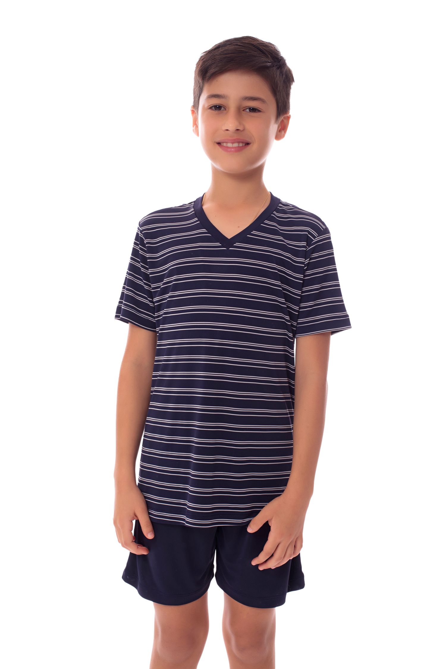Pijama Infantil Masculino Heitor Curto - Conjunto de pijama composto por camiseta de manga curta e bermuda, ideal para os dias mais quentes. A parte superior é confeccionada em Malha Plume listrada ? um tecido leve, ultramacio e com toque sedoso, que proporciona conforto térmico e excelente caimento. A camiseta apresenta modelagem confortável, com listras horizontais sutis que conferem um visual contemporâneo e delicado. A bermuda lisa, feita no mesmo material em cor coordenada, tem cós elástico embutido, garantindo ajuste prático e liberdade de movimentos. Um conjunto que une estilo, funcionalidade e bem-estar para o momento de descanso.