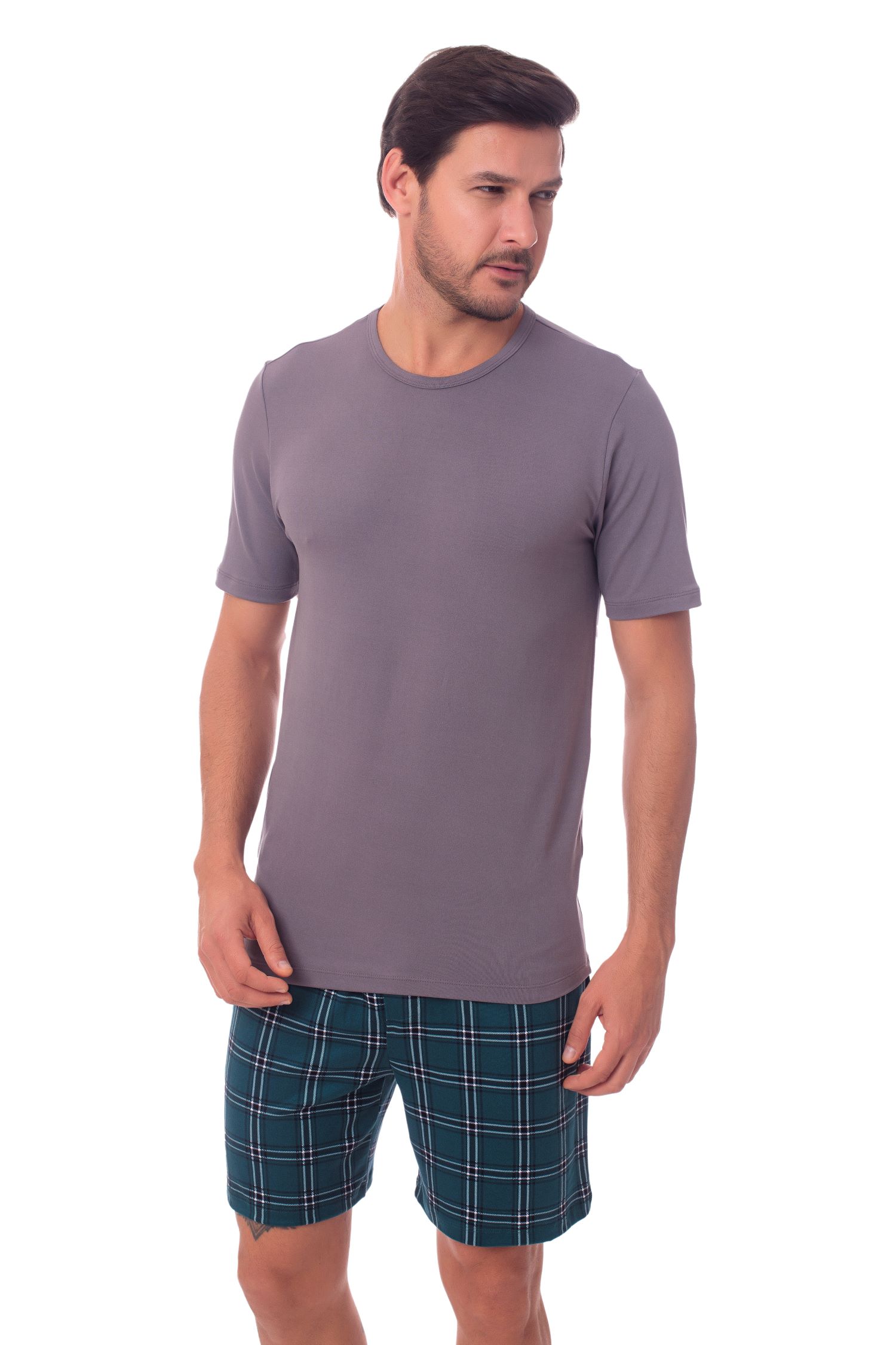 O Pijama Valentim é o clássico que se renova a cada coleção. A modelagem é tradicional e básica. O diferencial deste modelo, que agrada a todas as idades e estilos, está na matéria prima: a malha da camiseta é o soft plus que possui elastano em sua composição, assim como a malha do short, o suede light estampado, ambas com as mesmas características de leveza, conforto e toque macio de pele de pêssego. As blusas são de cores neutras e escuras, trazendo um ar sofisticado ao pijama.