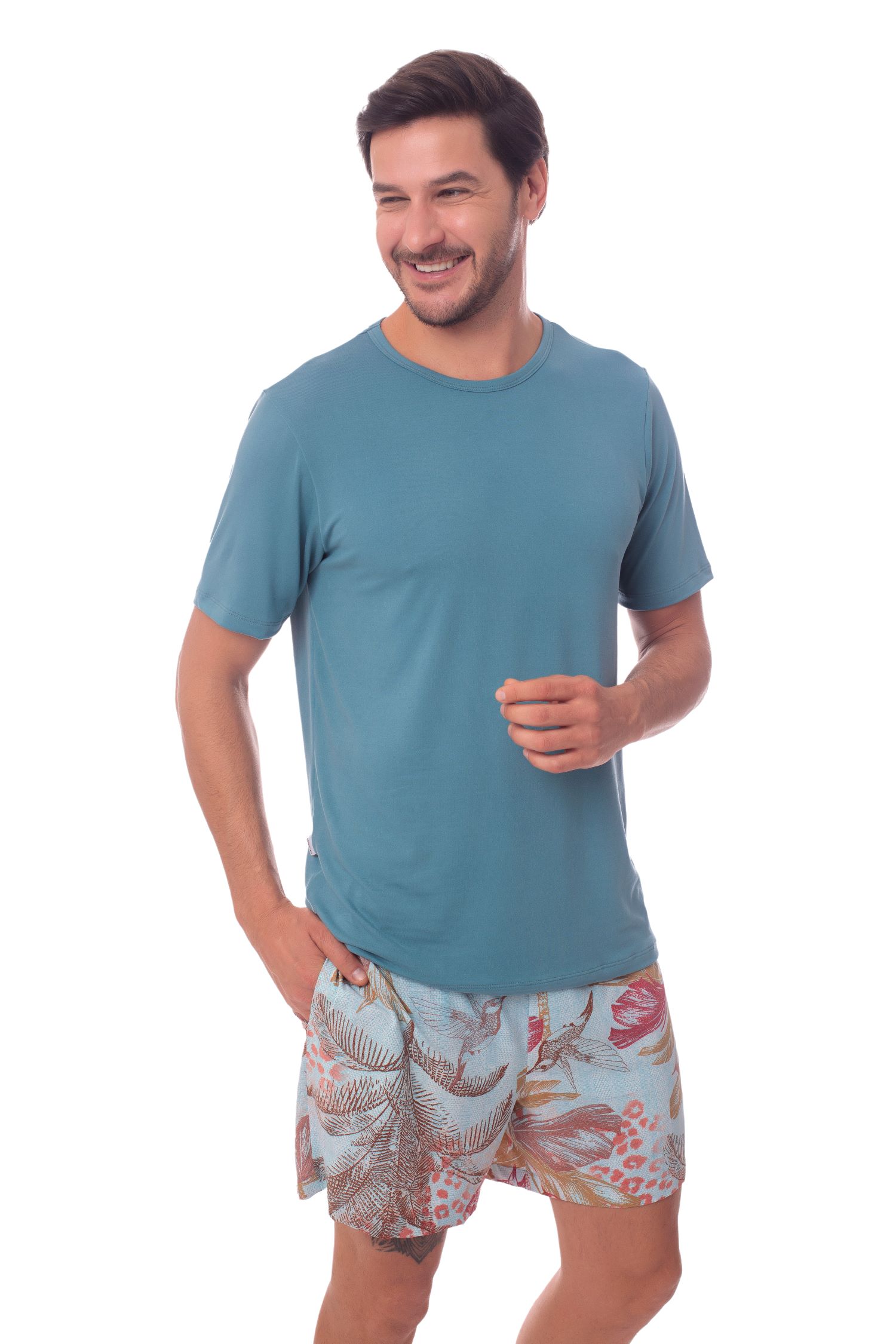 Pijama masculino composto por camiseta lisa de manga curta e bermuda estampada, ideal para os momentos de