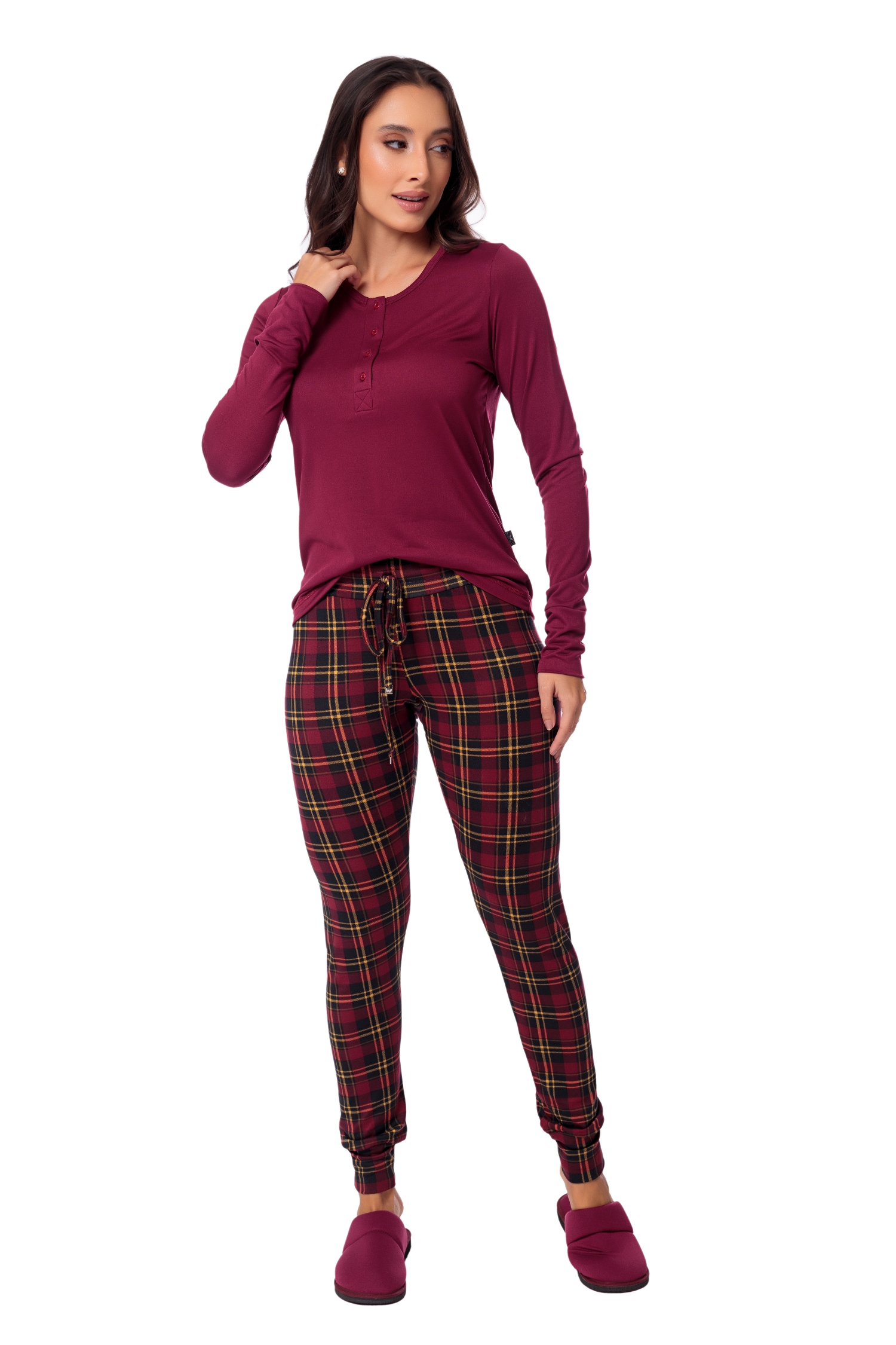 O pijama ANGEL é um produto de linha que possui ótima aceitação por suas características próprias, como o cós sem elástico que agrada as gestantes, as que passaram por algum tipo de cirurgia ou qualquer pessoa que não gosta de elástico na cintura. A modelagem da calça é ajustada, tipo legging e o cós é regulável. Na blusa, a abertura com patê fornece um detalhe bonito e funcional, que também agrada as lactantes. O artigo utilizado na sua produção é o suede light, malha extremamente aconchegante e macia, com toque de pele de pêssego. A blusa lisa contrasta com a padronagem xadrez da calça, criando um lindo pijama clássico e moderno ao mesmo tempo. Disponibilizamos também a versão masculina e infantil, para conectar casais e famílias.