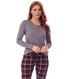 O pijama ANGEL é um produto de linha que possui ótima aceitação por suas características próprias, como o cós sem elástico que agrada as gestantes, as que passaram por algum tipo de cirurgia ou qualquer pessoa que não gosta de elástico na cintura. A modelagem da calça é ajustada, tipo legging e o cós é regulável. Na blusa, a abertura com patê fornece um detalhe bonito e funcional, que também agrada as lactantes. O artigo utilizado na sua produção é o suede light, malha extremamente aconchegante e macia, com toque de pele de pêssego. A blusa lisa contrasta com a padronagem xadrez da calça, criando um lindo pijama clássico e moderno ao mesmo tempo. Disponibilizamos também a versão masculina e infantil, para conectar casais e famílias.