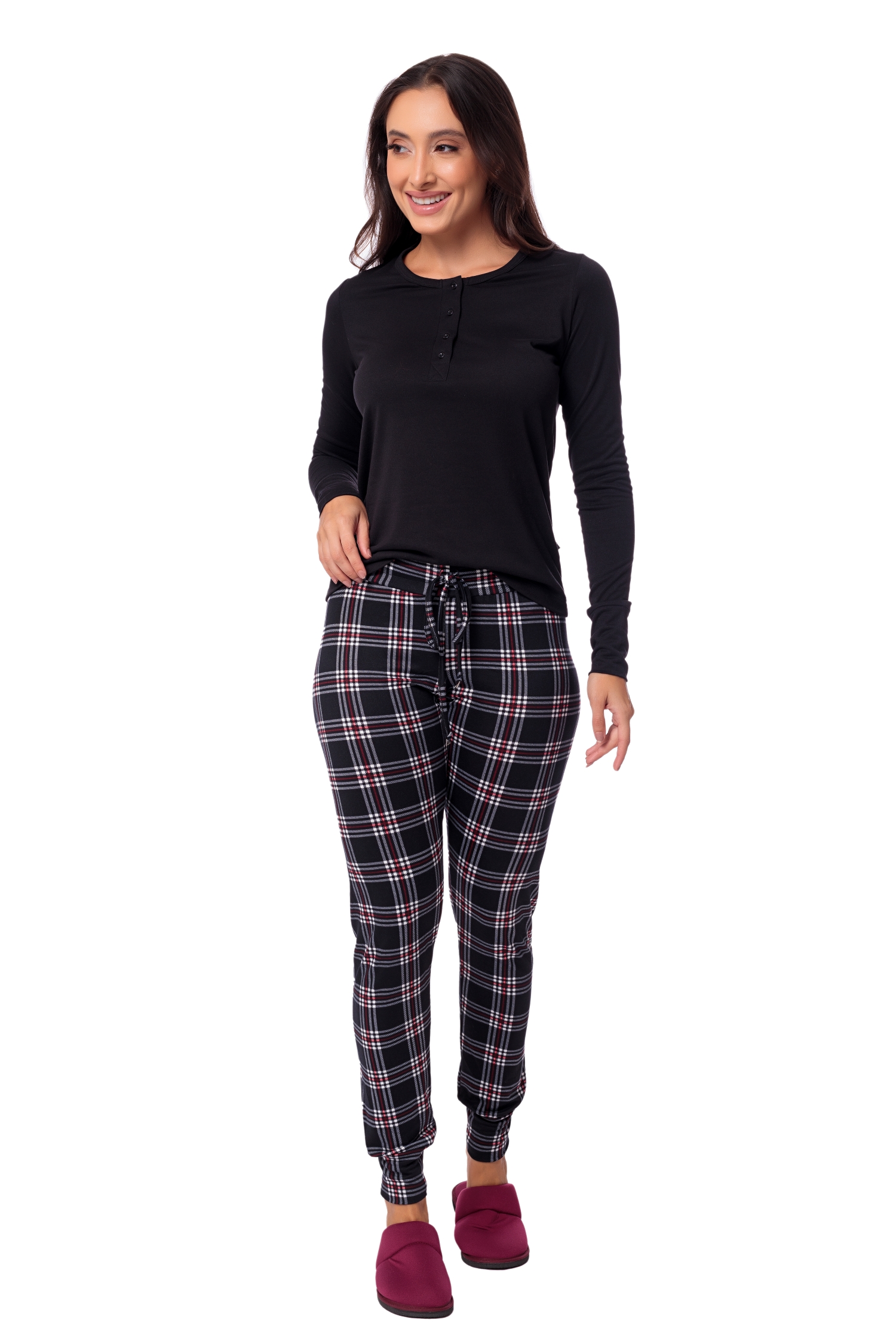 O pijama ANGEL é um produto de linha que possui ótima aceitação por suas características próprias, como o cós sem elástico que agrada as gestantes, as que passaram por algum tipo de cirurgia ou qualquer pessoa que não gosta de elástico na cintura. A modelagem da calça é ajustada, tipo legging e o cós é regulável. Na blusa, a abertura com patê fornece um detalhe bonito e funcional, que também agrada as lactantes. O artigo utilizado na sua produção é o suede light, malha extremamente aconchegante e macia, com toque de pele de pêssego. A blusa lisa contrasta com a padronagem xadrez da calça, criando um lindo pijama clássico e moderno ao mesmo tempo. Disponibilizamos também a versão masculina e infantil, para conectar casais e famílias.