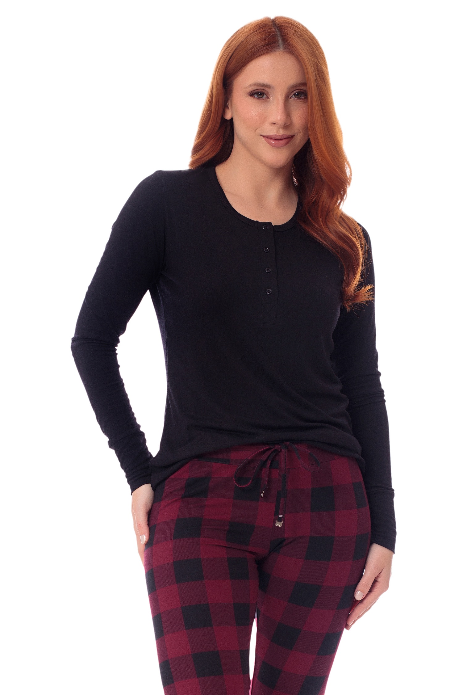 O pijama ANGEL é um produto de linha que possui ótima aceitação por suas características próprias, como o cós sem elástico que agrada as gestantes, as que passaram por algum tipo de cirurgia ou qualquer pessoa que não gosta de elástico na cintura. A modelagem da calça é ajustada, tipo legging e o cós é regulável. Na blusa, a abertura com patê fornece um detalhe bonito e funcional, que também agrada as lactantes. O artigo utilizado na sua produção é o suede light, malha extremamente aconchegante e macia, com toque de pele de pêssego. A blusa lisa contrasta com a padronagem xadrez da calça, criando um lindo pijama clássico e moderno ao mesmo tempo. Disponibilizamos também a versão masculina e infantil, para conectar casais e famílias.