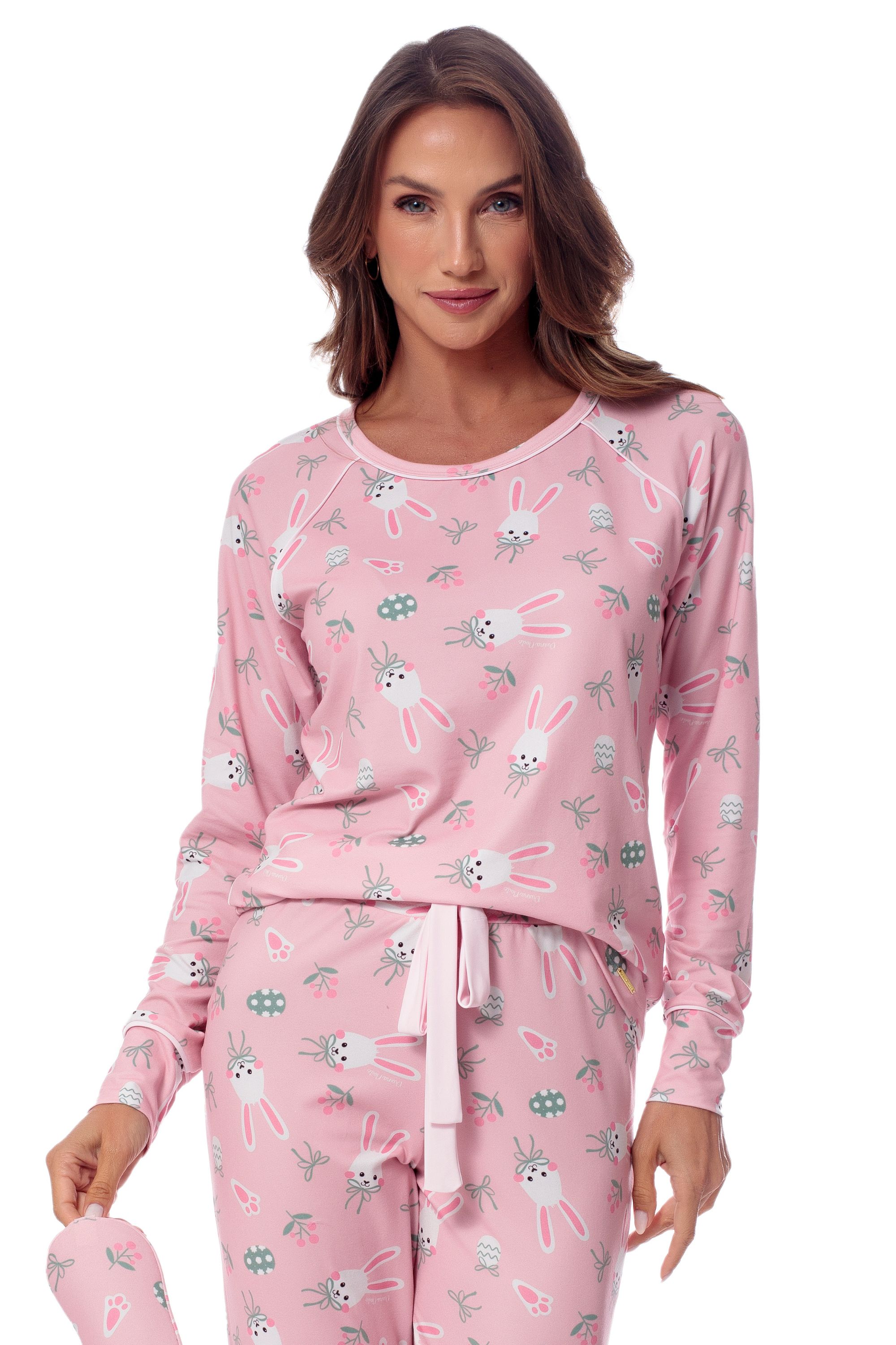 O pijama BRUNA traz uma modelagem muito confortável e desenvolvida com mangas raglan realçadas por vivo contrastante e um lindo laço na cintura da calça na mesma cor. Porém o grande diferencial deste produto está na delicada estampa de coelhinhos de Páscoa desenvolvidas exclusivamente pela Divina Noite. Na estampa, além de lindos coelhos e ovos, os laços inspirados no tema da coleção complementam a idéia de união. Estampado e produzido na malha dreams, já muito conhecida pelos clientes da marca por sua qualidade, conforto e maciez, este pijama carrega a certeza de uma Páscoa aconchegante e divertida. Disponível também na versão infantil.