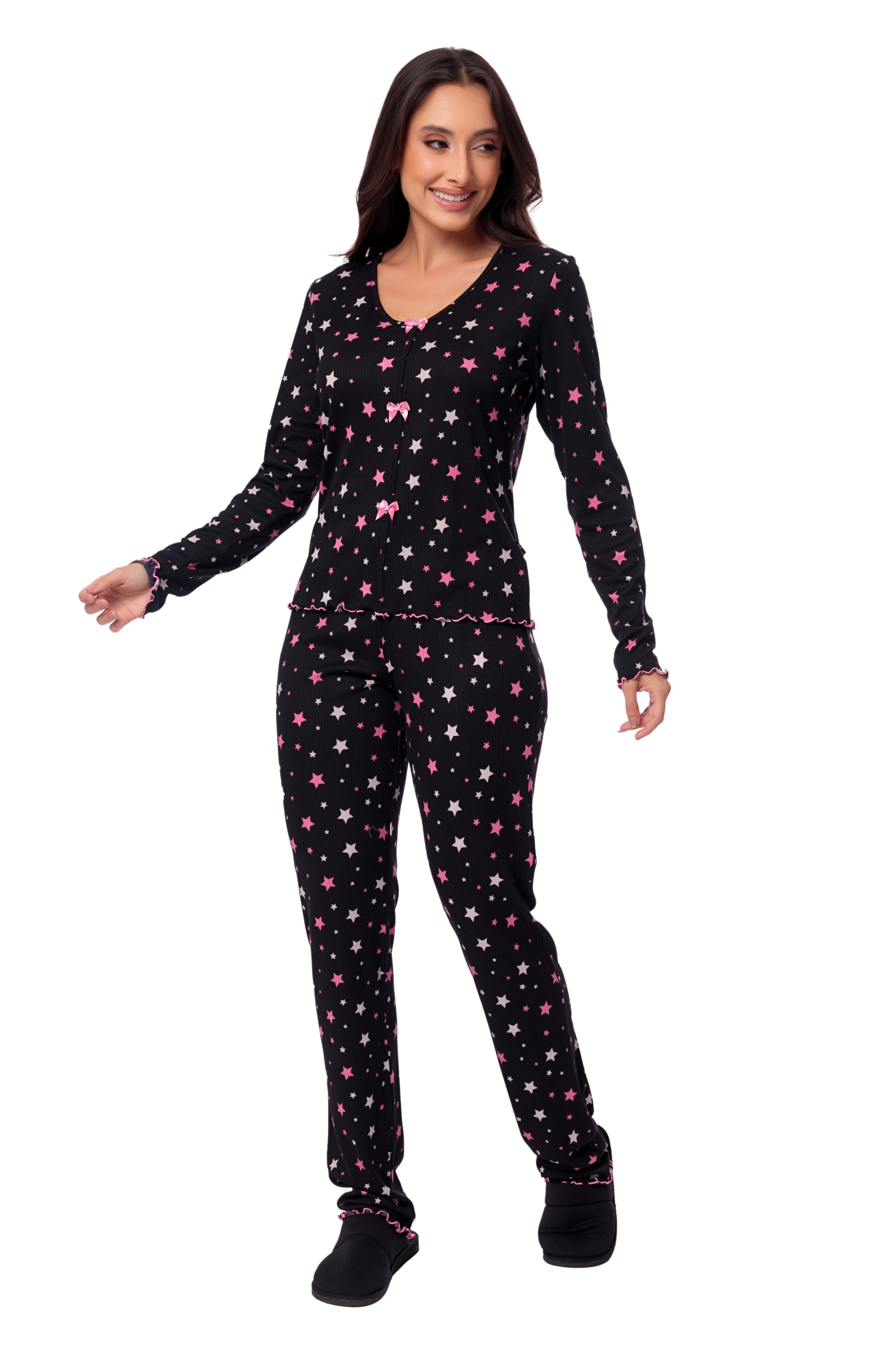 O pijama CLAUDIA foi produzido em malha Suede Light Rib, um tipo de suede canelado. Esta malha é bastante maleável e possui toque macio. Além das versões lisas, disponibilizamos variantes com estampas de estrelas, sempre presentes no sleepwear. A frente possui uma falsa abertura, que é arrematada por laços contrastantes, lembrando o tema da coleção: Entrelaços. Frufrus e laços dão o ar romântico ao modelo.