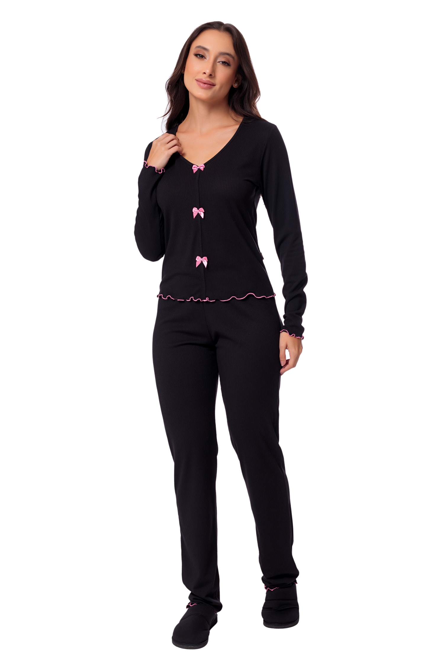 O pijama CLAUDIA foi produzido em malha Suede Light Rib, um tipo de suede canelado. Esta malha é bastante maleável e possui toque macio. Além das versões lisas, disponibilizamos variantes com estampas de estrelas, sempre presentes no sleepwear. A frente possui uma falsa abertura, que é arrematada por laços contrastantes, lembrando o tema da coleção: Entrelaços. Frufrus e laços dão o ar romântico ao modelo.