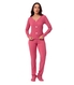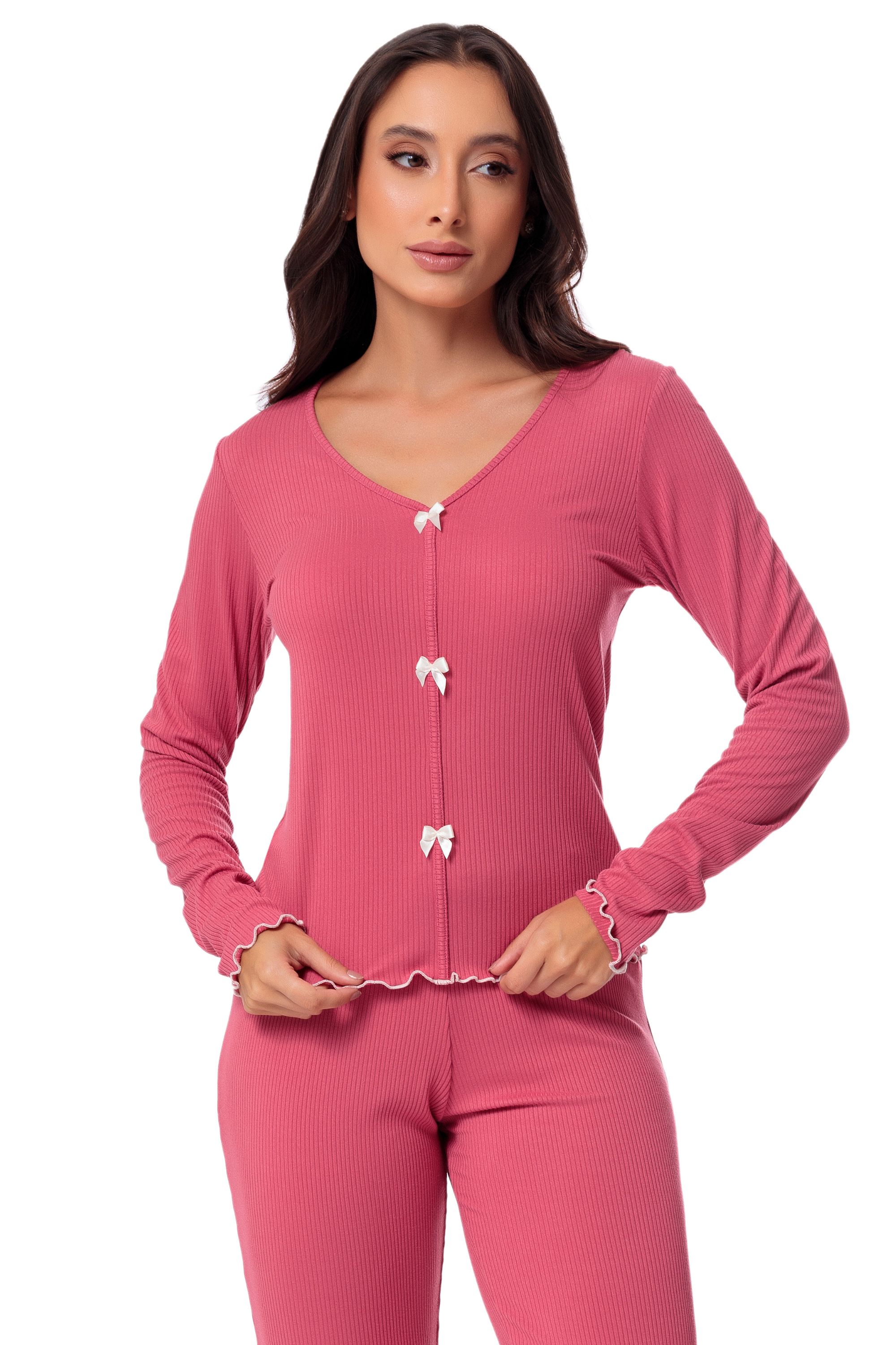 O pijama CLAUDIA foi produzido em malha Suede Light Rib, um tipo de suede canelado. Esta malha é bastante maleável e possui toque macio. Além das versões lisas, disponibilizamos variantes com estampas de estrelas, sempre presentes no sleepwear. A frente possui uma falsa abertura, que é arrematada por laços contrastantes, lembrando o tema da coleção: Entrelaços. Frufrus e laços dão o ar romântico ao modelo.