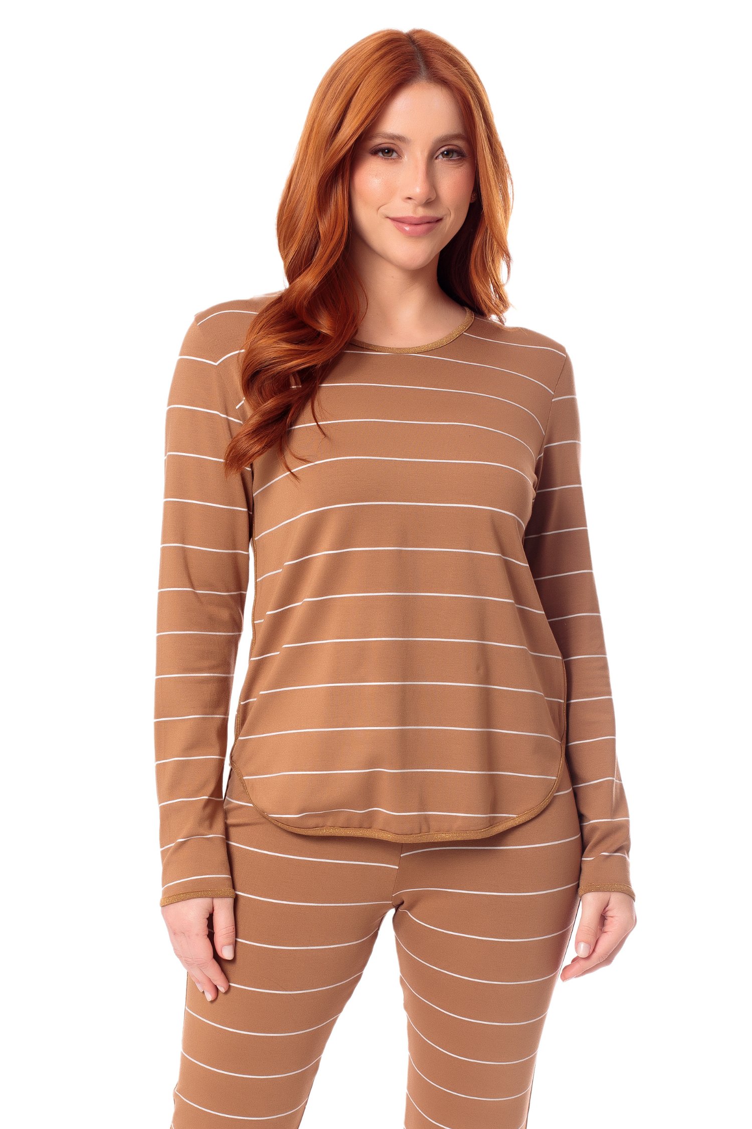 O pijama DANY traz para a coleção um listrado muito elegante, bicolor, minimalista. Produzido malha massimo, que possui a viscose como principal componente, este modelo traz um certo frescor, e por não ser muito quente é ideal para meia estação. Sua modelagem básica é enriquecida com acabamentos em viés de lurex, que traz um brilho discreto ao modelo.