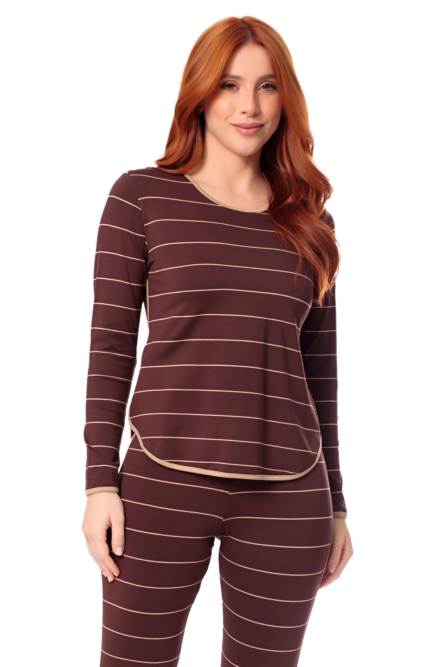 O pijama DANY traz para a coleção um listrado muito elegante, bicolor, minimalista. Produzido malha massimo, que possui a viscose como principal componente, este modelo traz um certo frescor, e por não ser muito quente é ideal para meia estação. Sua modelagem básica é enriquecida com acabamentos em viés de lurex, que traz um brilho discreto ao modelo.