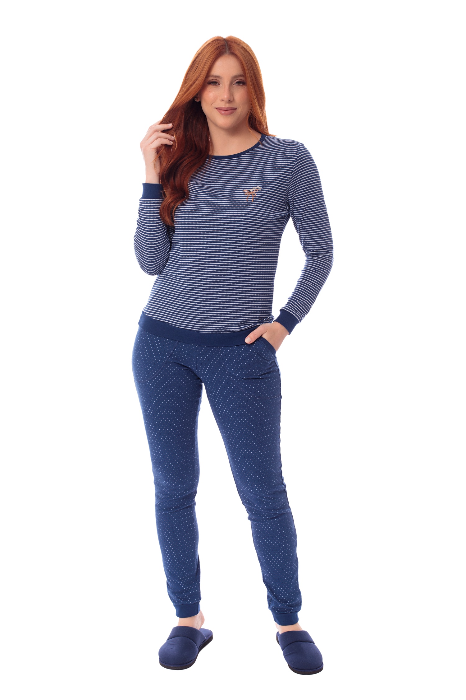 Este é aquele modelo de pijama que pode até ser usado como um conjunto. Ideal para quem valoriza o algodão, o pijama DÉBORA foi produzido em suedine dupla face, fazendo um jogo de listras e poás que ficaram muito harmoniosos entre si. Os detalhes em ribana lisa dão todo o acabamento necessário ao modelo. E para o acabamento final, um lindo bordado que chama para o tema da coleção Entrelaços.