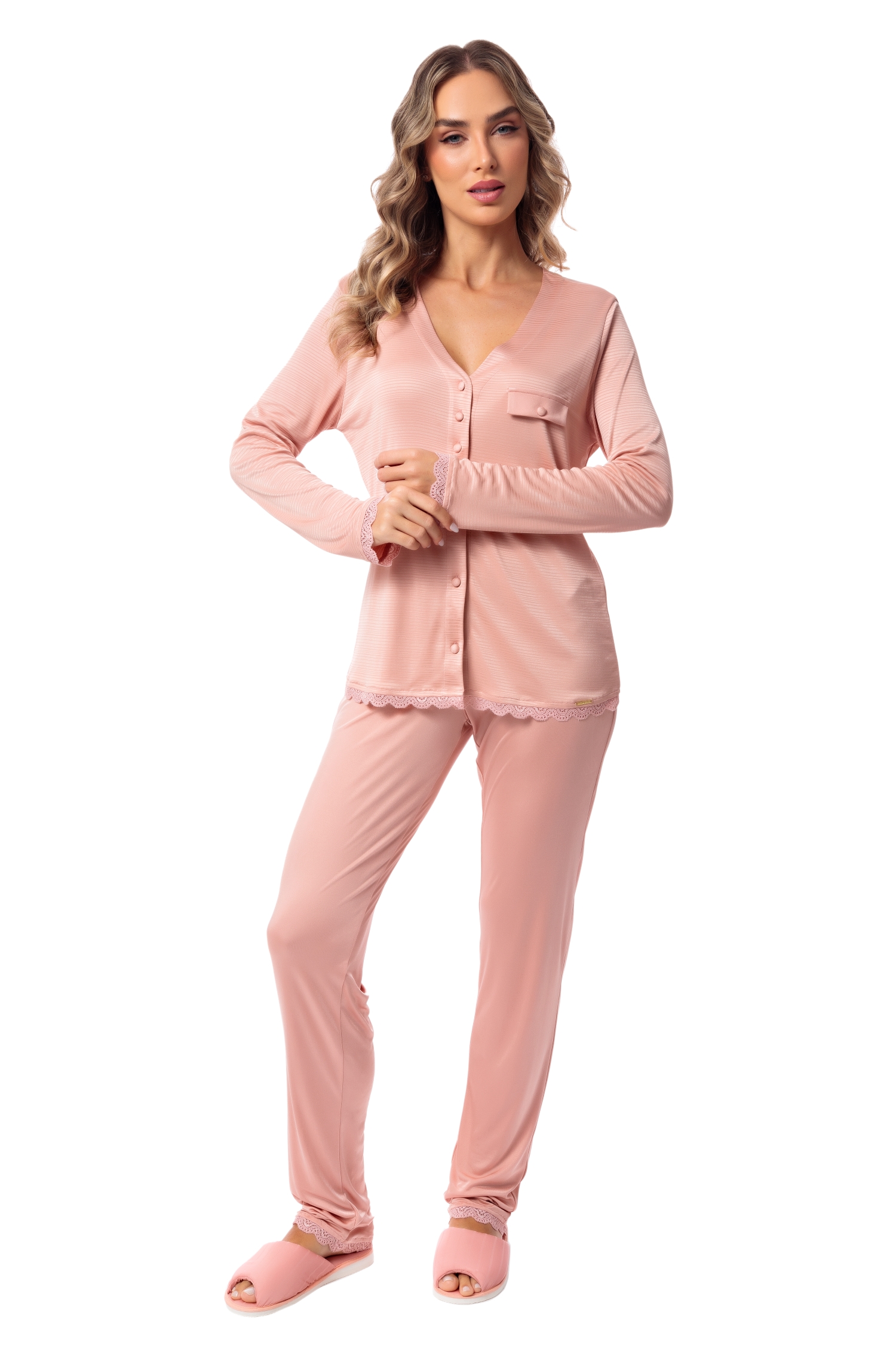 O Pijama Elis possui abertura na frente com botões cuidadosamente forrados da mesma malha, para dar um aspecto mais nobre ao modelo. Sua modelagem é muito útil em processos cirúrgicos, além de agradar também as mamães que amamentam. Os acabamentos em renda dão um ar de delicadeza ao modelo, que foi desenvolvido em malha plume, popularmente conhecida como malha fria. Esta malha foi feita a partir da perfeita combinação entre o design e a inovadora tecnologia da poliamida Amni, proporcionando respirabilidade, fácil lavagem e secagem, artigo produzido de forma sustentável. É uma malha de alta durabilidade, leve e fluida.