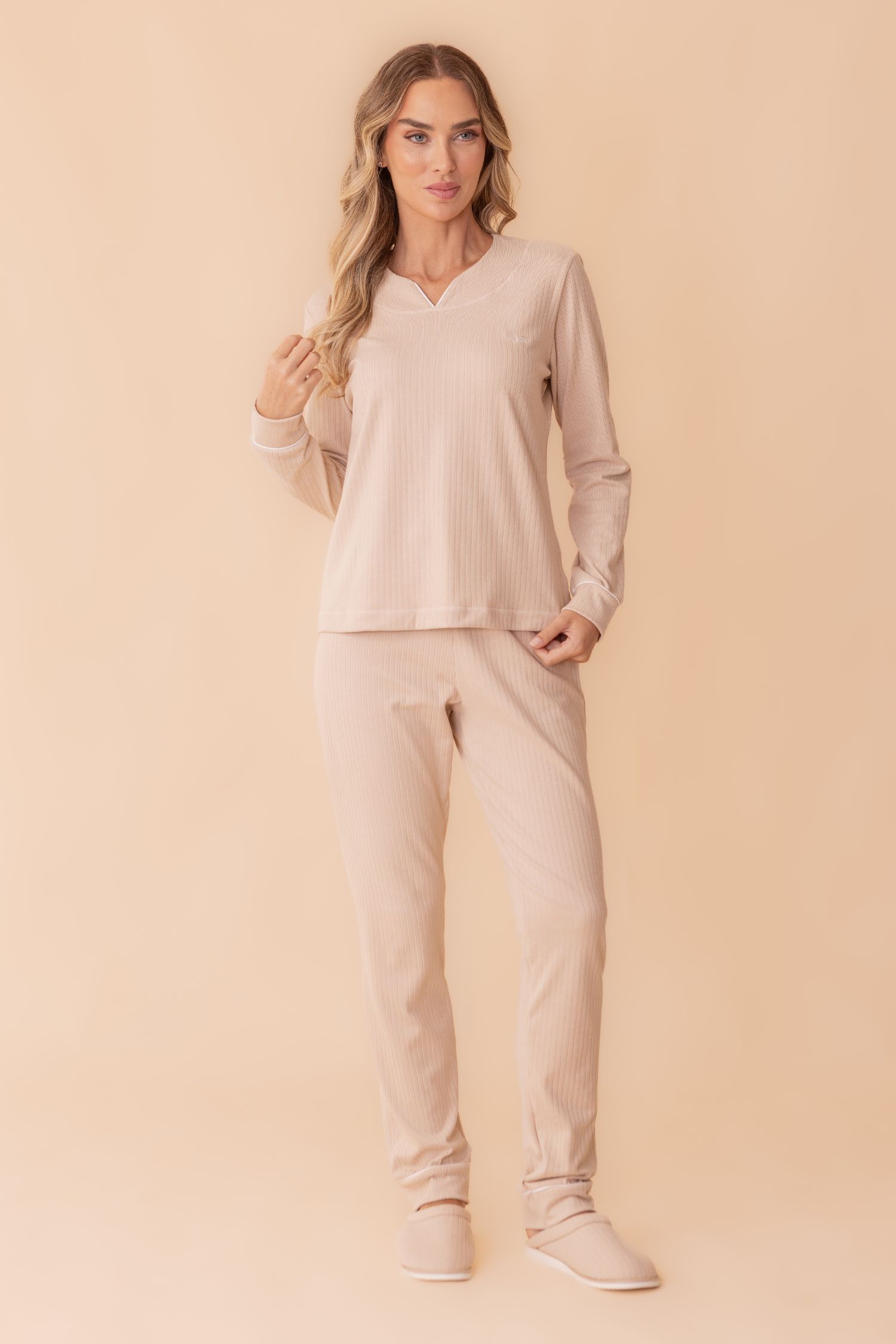 O PIJAMA ELOÍSA foi desenvolvido em Malha Australiana Canelada, um artigo extremamente macio, que possui um toque levemente peluciado, aveludado. Sua textura de listras verticais em relevo (caneluras), oferece boa elasticidade e bom caimento. O charme do modelo fica por conta de detalhe em ?V? na modelagem do decote, revestido por vivo contrastante. Este mesmo vivo realça punhos e barra. E para finalizar, um discreto bordado da marca harmoniza com a cor do vivo, trazendo sofisticação e presença ao modelo.