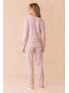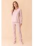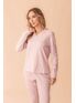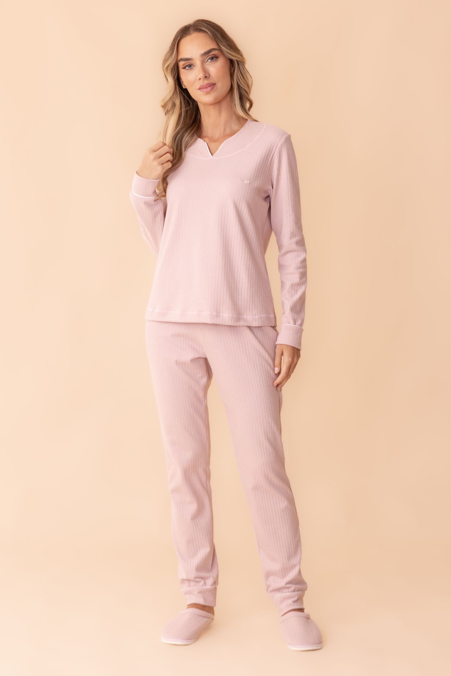 O PIJAMA ELOÍSA foi desenvolvido em Malha Australiana Canelada, um artigo extremamente macio, que possui um toque levemente peluciado, aveludado. Sua textura de listras verticais em relevo (caneluras), oferece boa elasticidade e bom caimento. O charme do modelo fica por conta de detalhe em ?V? na modelagem do decote, revestido por vivo contrastante. Este mesmo vivo realça punhos e barra. E para finalizar, um discreto bordado da marca harmoniza com a cor do vivo, trazendo sofisticação e presença ao modelo.