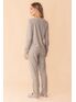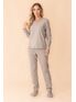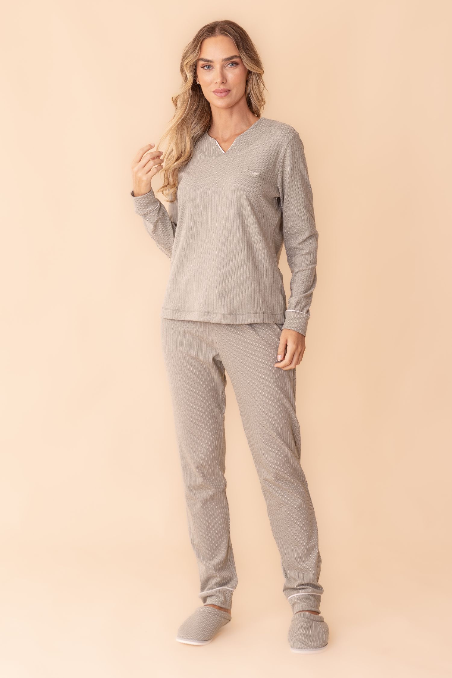 O PIJAMA ELOÍSA foi desenvolvido em Malha Australiana Canelada, um artigo extremamente macio, que possui um toque levemente peluciado, aveludado. Sua textura de listras verticais em relevo (caneluras), oferece boa elasticidade e bom caimento. O charme do modelo fica por conta de detalhe em ?V? na modelagem do decote, revestido por vivo contrastante. Este mesmo vivo realça punhos e barra. E para finalizar, um discreto bordado da marca harmoniza com a cor do vivo, trazendo sofisticação e presença ao modelo.