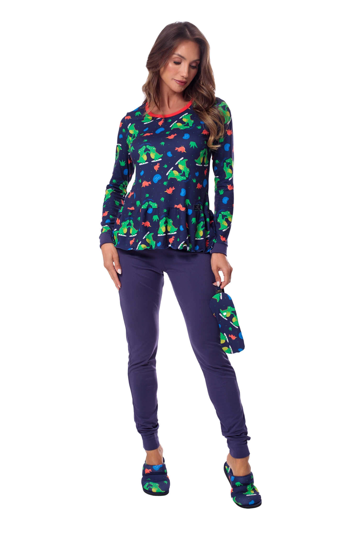 A Divina Noite sempre oferece aos seus clientes opções de pijamas divertidos para toda a família usar e criar boas memórias. Nesta coleção a estampa exclusiva remete ao tema Entrelaços, colocando simpáticos jacarés unidos, na melhor tradução do better together!! A blusa estampada com barra de babado franzido contrasta com a calça tipo legging lisa. Tudo para curtir com charme os momentos de relax e união em família.