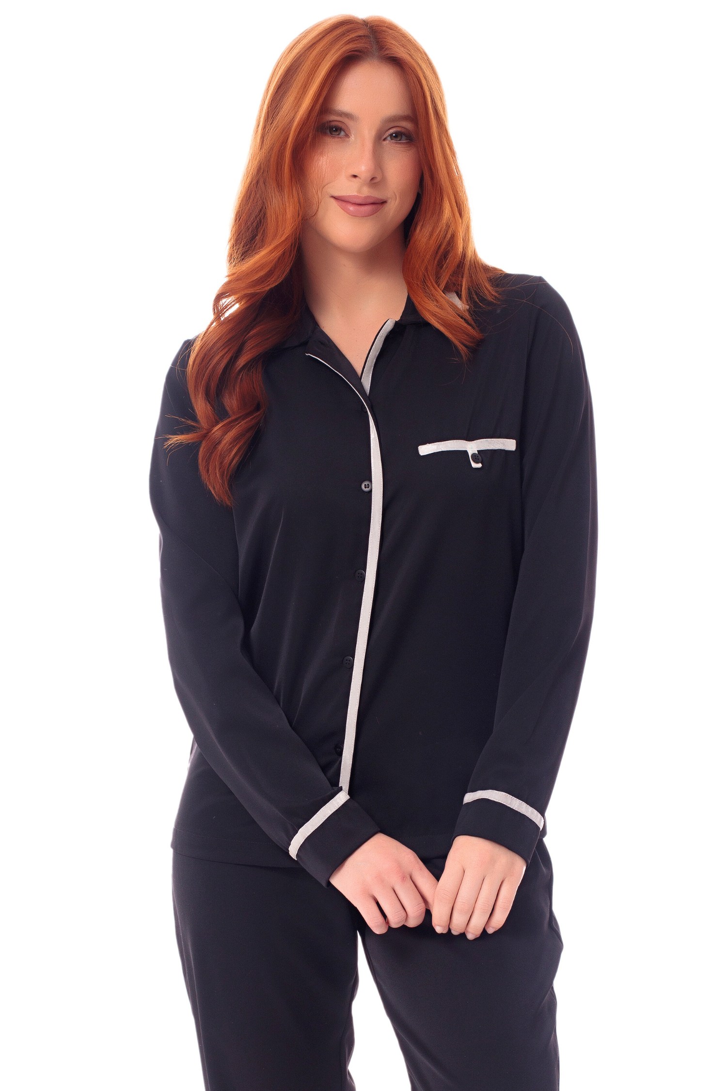 O pijama GRÉCIA foi inspirado em uma mulher de estilo elegante. Isso porque o tecido plano deste modelo, denominado daiquiri, lembra uma seda e traz refinamento ao look. A modelagem é clássica, aberta tipo camisa e é diferenciada pela aplicação da fita de veludo nos acabamentos. As costuras são todas embutidas para aumentar a qualidade e atender as clientes mais exigentes. Este modelo ultrapassa os limites da roupa de dormir e pode ser usado nas ruas com muito estilo.