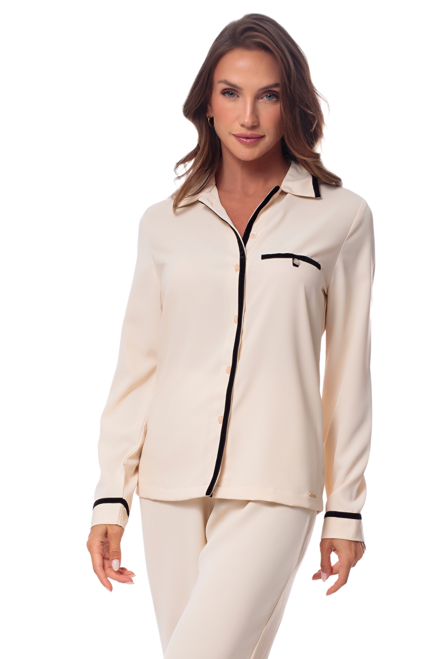 O pijama GRÉCIA foi inspirado em uma mulher de estilo elegante. Isso porque o tecido plano deste modelo, denominado daiquiri, lembra uma seda e traz refinamento ao look. A modelagem é clássica, aberta tipo camisa e é diferenciada pela aplicação da fita de veludo nos acabamentos. As costuras são todas embutidas para aumentar a qualidade e atender as clientes mais exigentes. Este modelo ultrapassa os limites da roupa de dormir e pode ser usado nas ruas com muito estilo.