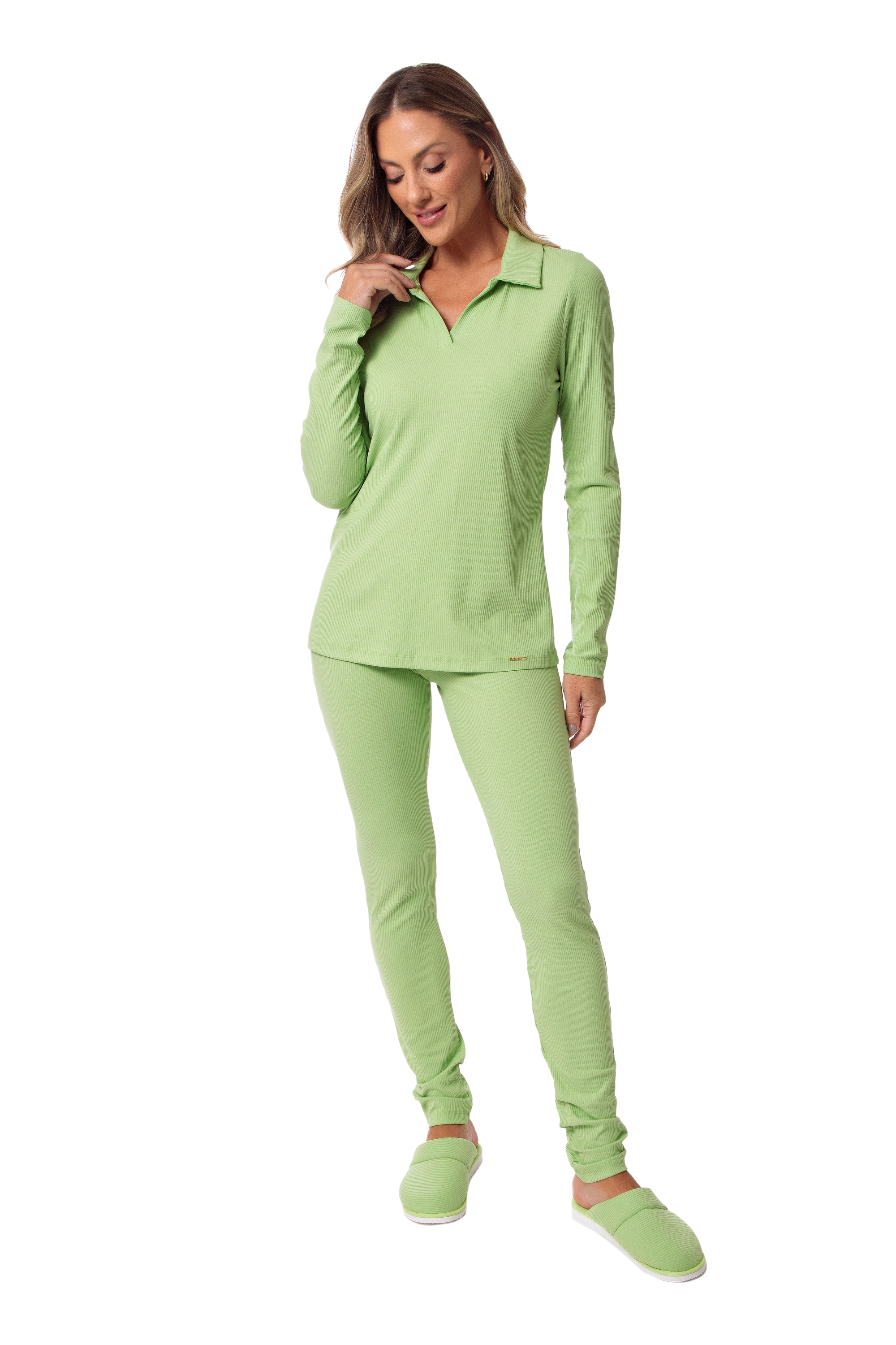 O Pijama Kate foi pensado para atender uma mulher de estilo casual com toque clássico, pois seu modelo com abertura em V e gola, remete à camisaria. A modelagem da calça é mais ajustada, mas a blusa solta traz o conforto necessário. A malha Boreal possui canelado estreito e é desenvolvida de forma sustentável com viscose e elastano da mais alta qualidade.