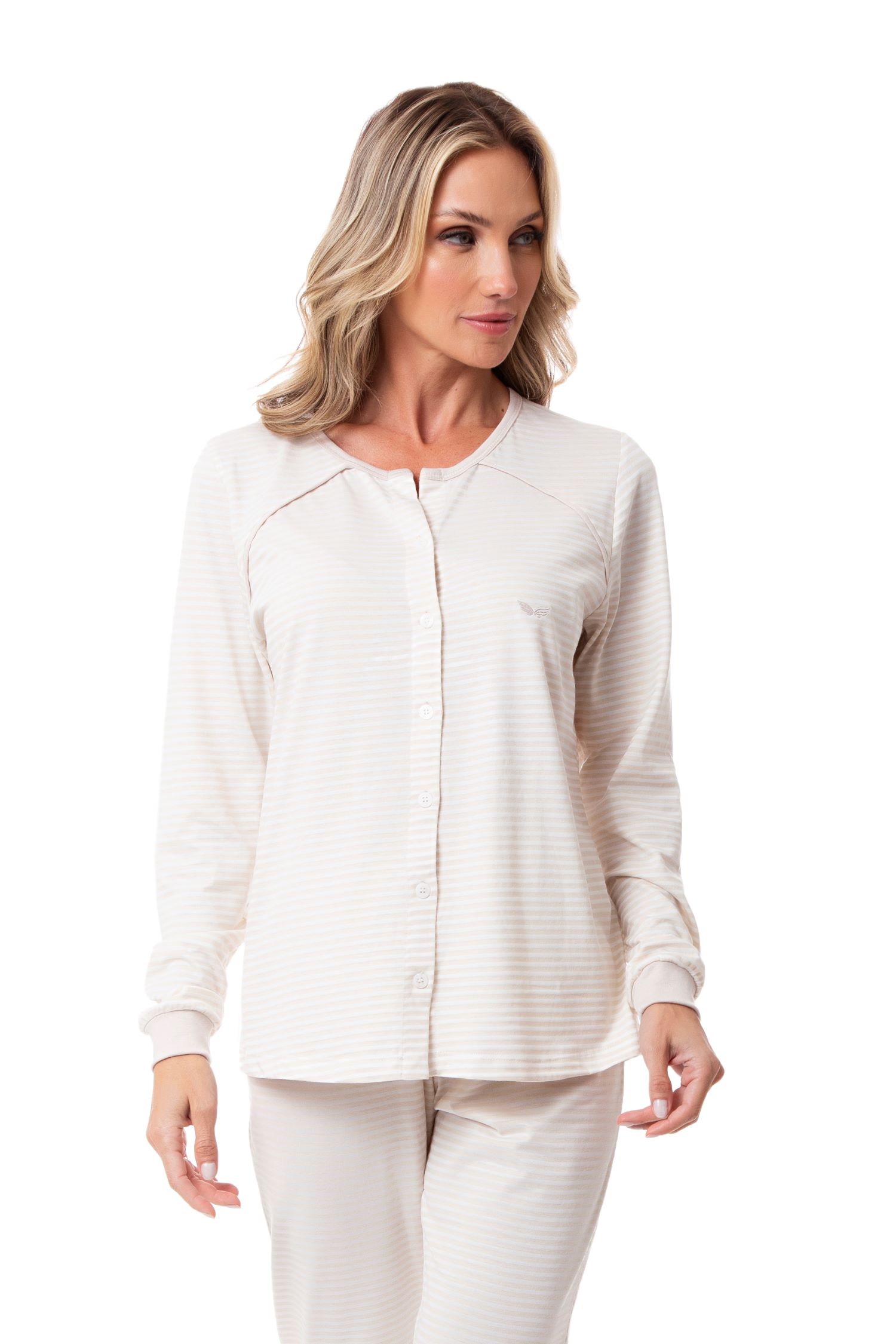 LIstras em cores claras e delicadas formam a família Lilian. Na versão aberta, optamos por um modelo sem gola e com recortes de vivo que valorizam o corpo. A malha é em algodão e os acabamentos possuem o conforto da ribana. A malha P.A. é composta pela mistura entre algodão e poliéster, o que traz flexibilidade, maciez, durabilidade e maior fixação da cor para a malha e consequentemente para o modelo. *Produto vendido individualmente. Não acompanha demais produtos ou acessórios visíveis na imagem.