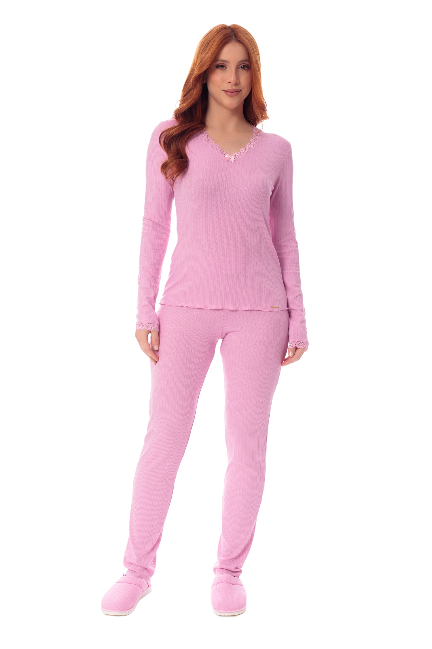 O pijama Patricinha tem toque suave e acabamento refinado. Modelagem mais ajustada ao corpo, valorizando a silhueta com discrição e aconchego, ideal para quem busca bem-estar sem abrir mão da elegância. A gola é adornada com um delicado detalhe de renda, que traz um charme romântico e atemporal à peça. Esse mesmo toque de renda aparece nos punhos das mangas e da calça, criando uma harmonia visual sutil. Na base da gola, um pequeno lacinho de cetim completa o look com graciosidade, como uma assinatura feminina e encantadora. O tecido texturizado em malha confere uma sensação tátil envolvente, ao mesmo tempo em que garante respirabilidade e liberdade de movimento, fazendo desse pijama uma escolha perfeita para noites tranquilas e manhãs preguiçosas com estilo.