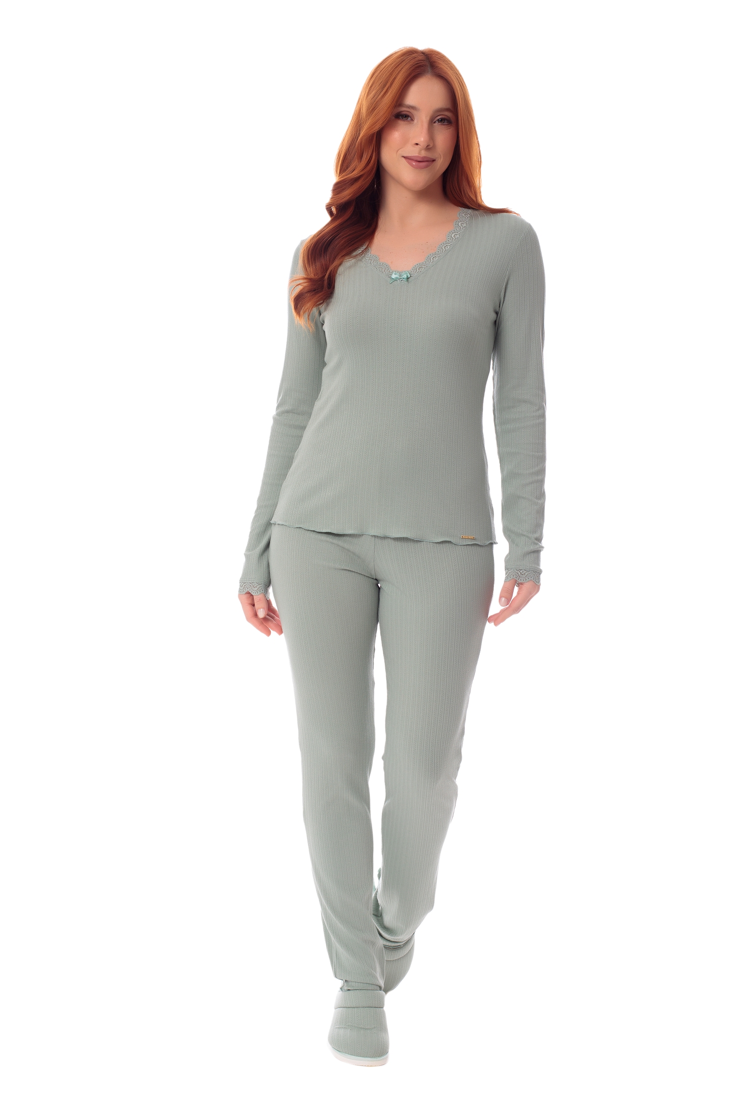 O pijama Patricinha tem toque suave e acabamento refinado. Modelagem mais ajustada ao corpo, valorizando a silhueta com discrição e aconchego, ideal para quem busca bem-estar sem abrir mão da elegância. A gola é adornada com um delicado detalhe de renda, que traz um charme romântico e atemporal à peça. Esse mesmo toque de renda aparece nos punhos das mangas e da calça, criando uma harmonia visual sutil. Na base da gola, um pequeno lacinho de cetim completa o look com graciosidade, como uma assinatura feminina e encantadora. O tecido texturizado em malha confere uma sensação tátil envolvente, ao mesmo tempo em que garante respirabilidade e liberdade de movimento, fazendo desse pijama uma escolha perfeita para noites tranquilas e manhãs preguiçosas com estilo.