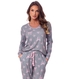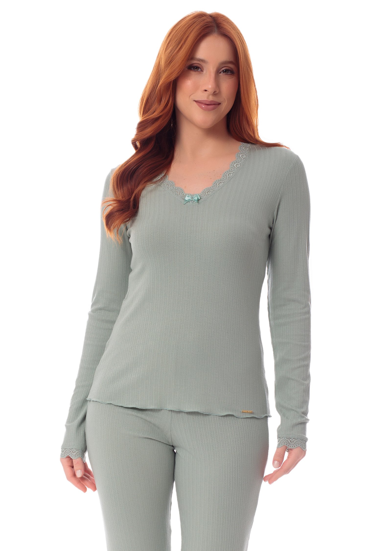 O pijama Patricinha tem toque suave e acabamento refinado. Modelagem mais ajustada ao corpo, valorizando a silhueta com discrição e aconchego, ideal para quem busca bem-estar sem abrir mão da elegância. A gola é adornada com um delicado detalhe de renda, que traz um charme romântico e atemporal à peça. Esse mesmo toque de renda aparece nos punhos das mangas e da calça, criando uma harmonia visual sutil. Na base da gola, um pequeno lacinho de cetim completa o look com graciosidade, como uma assinatura feminina e encantadora. O tecido texturizado em malha confere uma sensação tátil envolvente, ao mesmo tempo em que garante respirabilidade e liberdade de movimento, fazendo desse pijama uma escolha perfeita para noites tranquilas e manhãs preguiçosas com estilo.