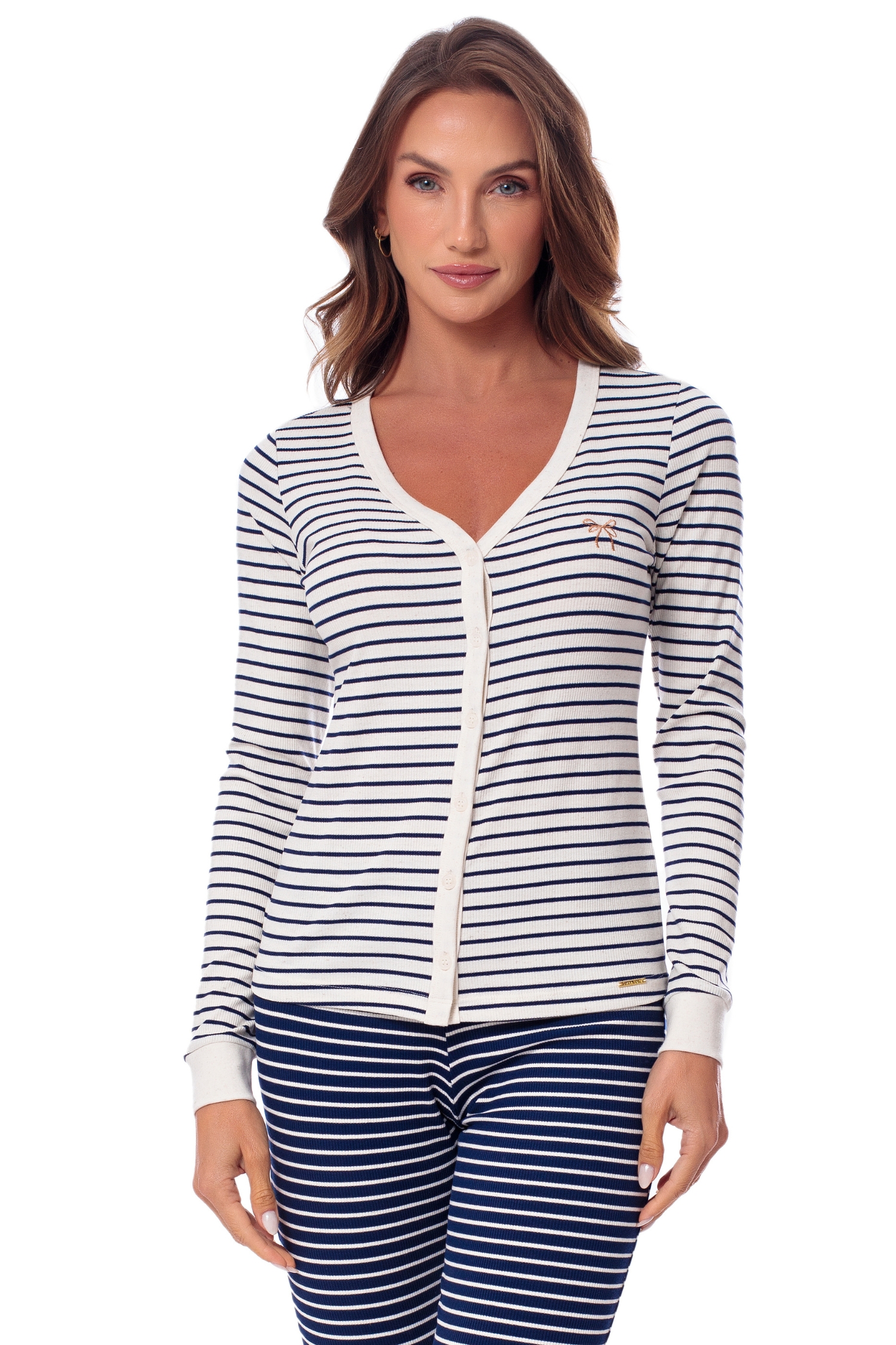 O pijama RÚBIA veio para trazer conforto e beleza para as mulheres que gostam ou precisam de um pijama aberto, seja para amamentação ou pós cirurgias. Desenvolvido em canelado sline linen, uma espécie de ribana listrada que possui um fundo em linho muito elegante. O composê entre listras positivas e negativas conferem design ao modelo e o bordado reforça o tema da coleção ?Entrelaços?, agregando valor a este pijama.